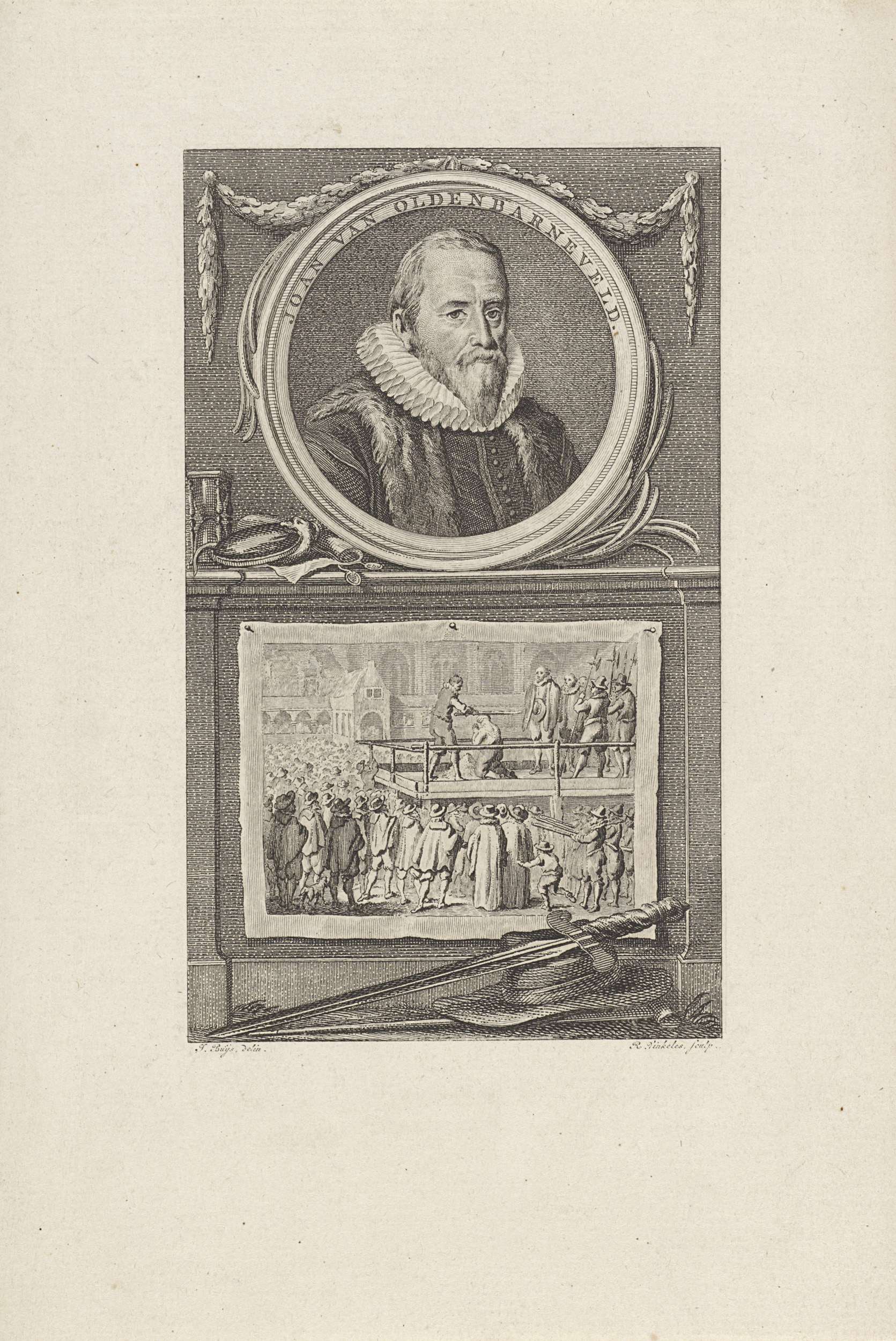 Portret van Johan van Oldenbarnevelt, jurist en landsadvocaat van Holland. Onder zijn portret een afbeelding van zijn executie op het schavot voor de Ridderzaal op het Haagse Binnenhof, opgeprikt vel papier. Op de voorgrond zijn hoed, wandelstok en het zwaard waarmee hij werd onthoofd.