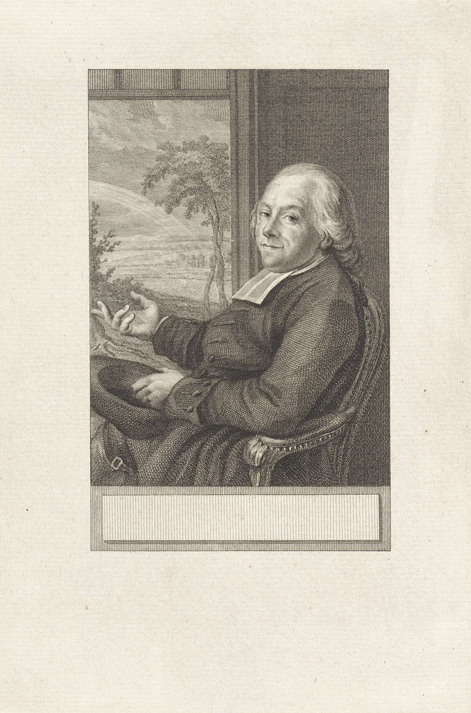 Portret van Joannes Florentius Martinet, predikant en pensionaris van Den Bosch. Hij zit met zijn hoed in de hand op een stoel bij een raam, waardoor een landschap met een regenboog zichtbaar is.