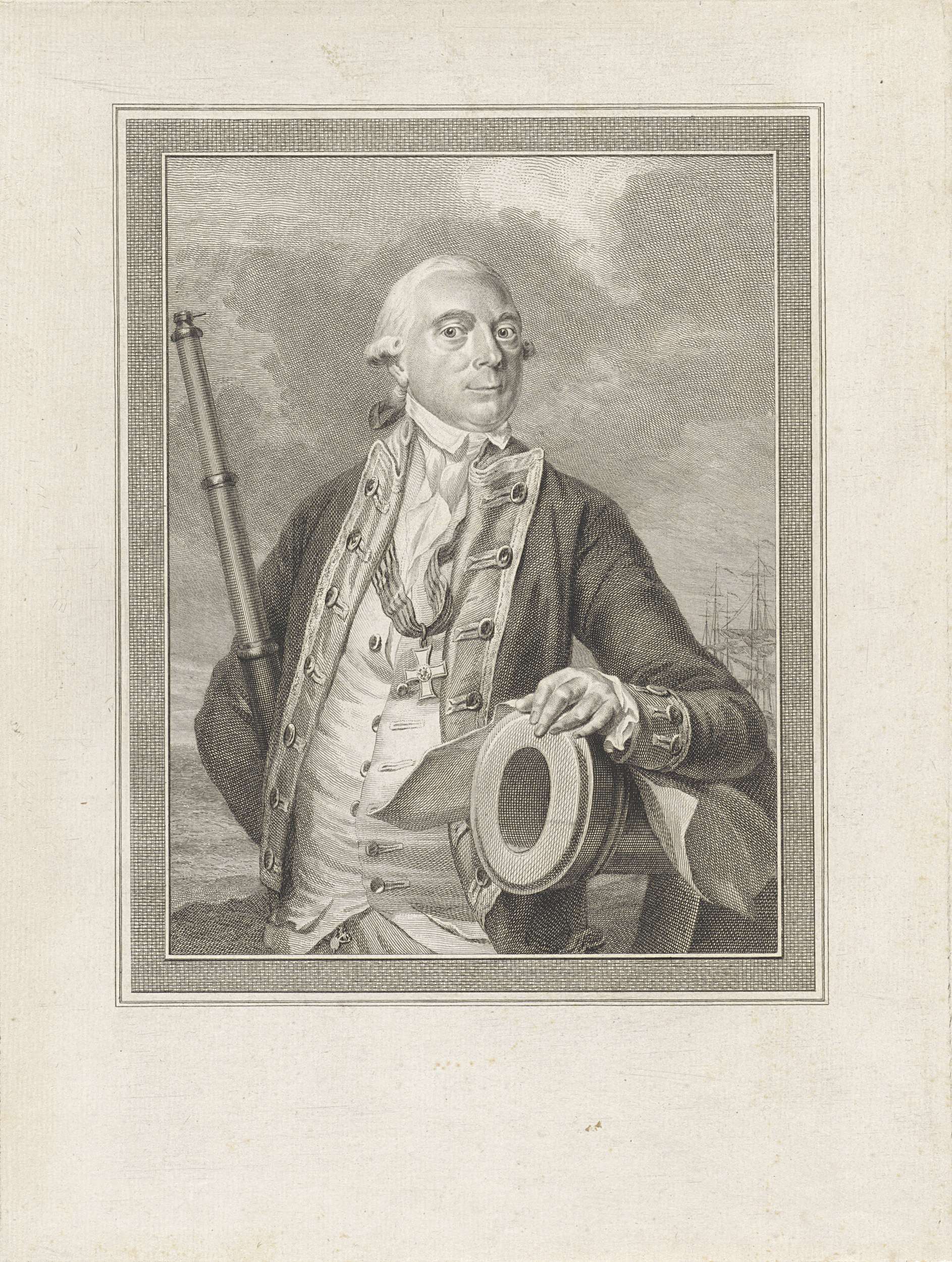 Portret van de Nederlandse admiraal Jan Hendrik van Kinsbergen, met een verrekijker en zijn arm rustend op een kanon.