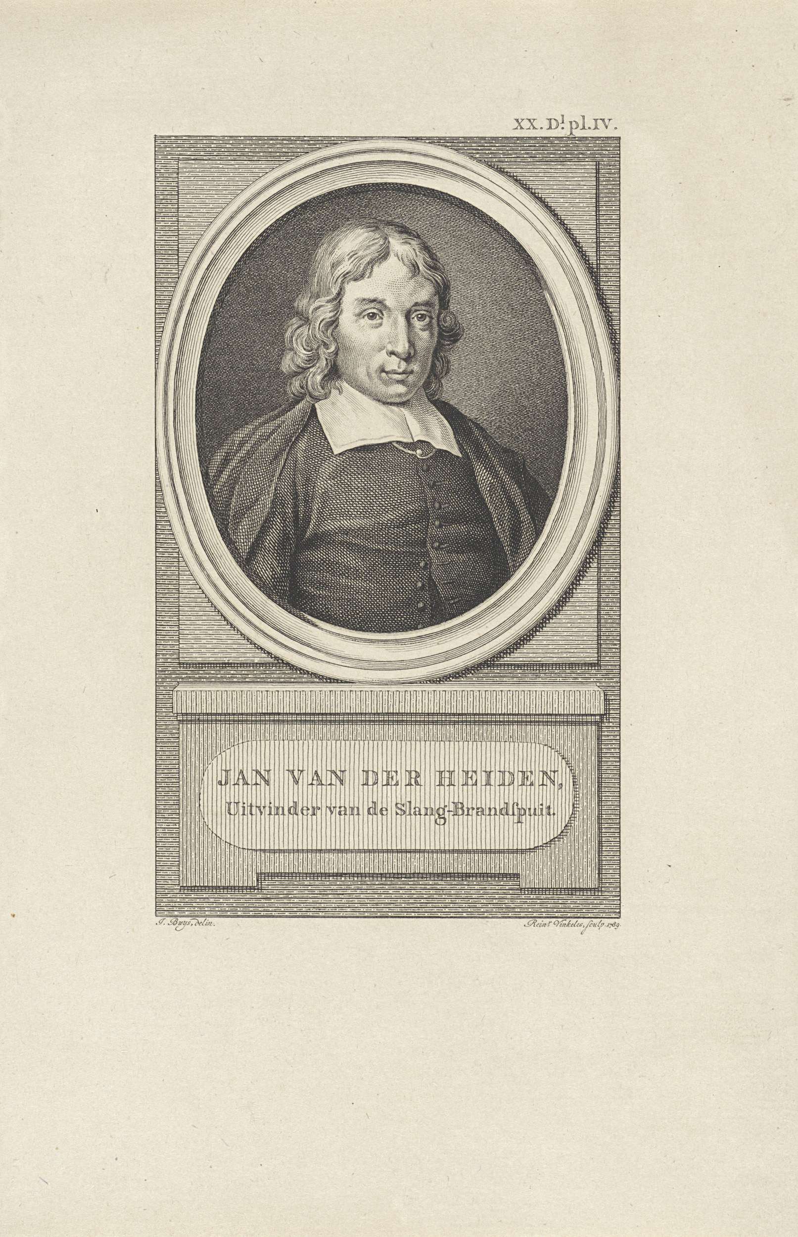 Portret van Jan van der Heyden, schilder en uitvinder van de slangbrandspuit te Amsterdam. Rechstboven: XX Dl. Pl. IV.