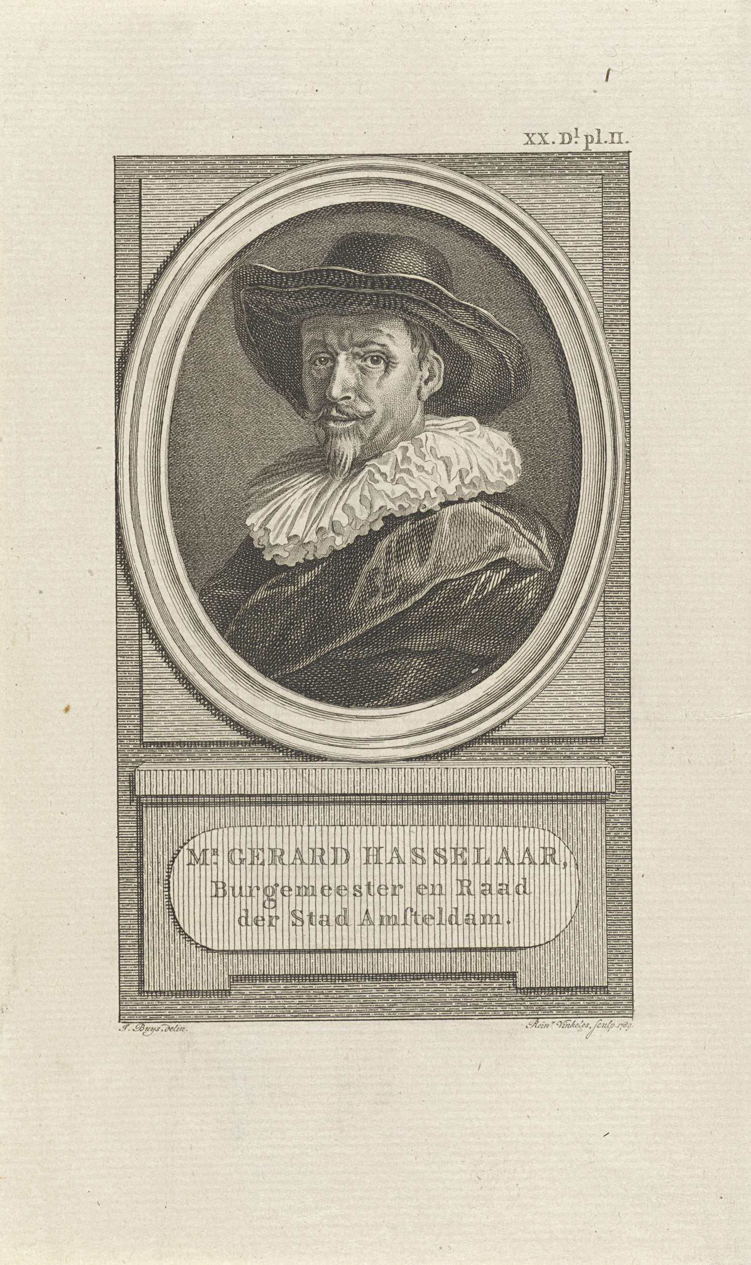 Portret van Gerard Hasselaar, burgemeester van de stad Amsterdam. Rechtsboven: XX. Dl. pl. II.