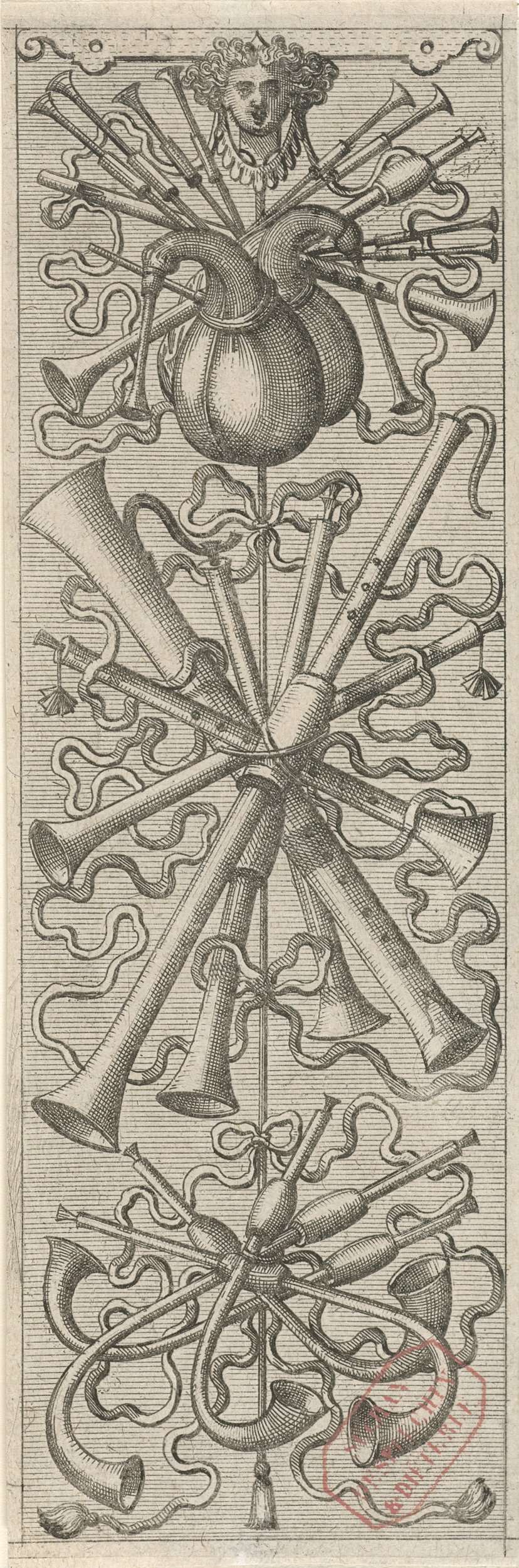 Blaasinstrumenten waaronder twee doedelzakken en kromhoorns. Uit serie, bestaande uit een titelblad en 16 bladen.