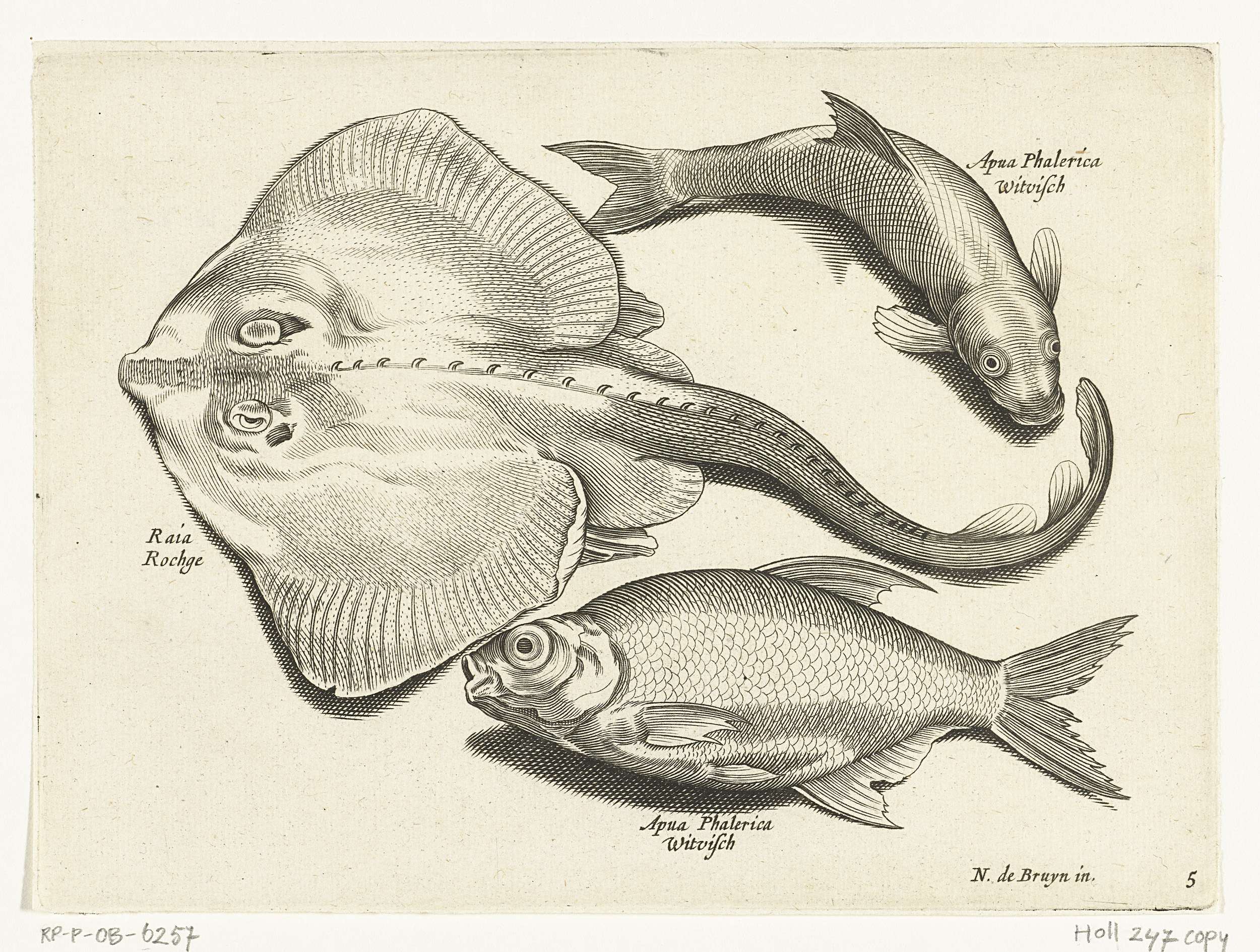 Rog, brasem en witvis, opschriften identificeren de vissen in Latijn en Nederlands.