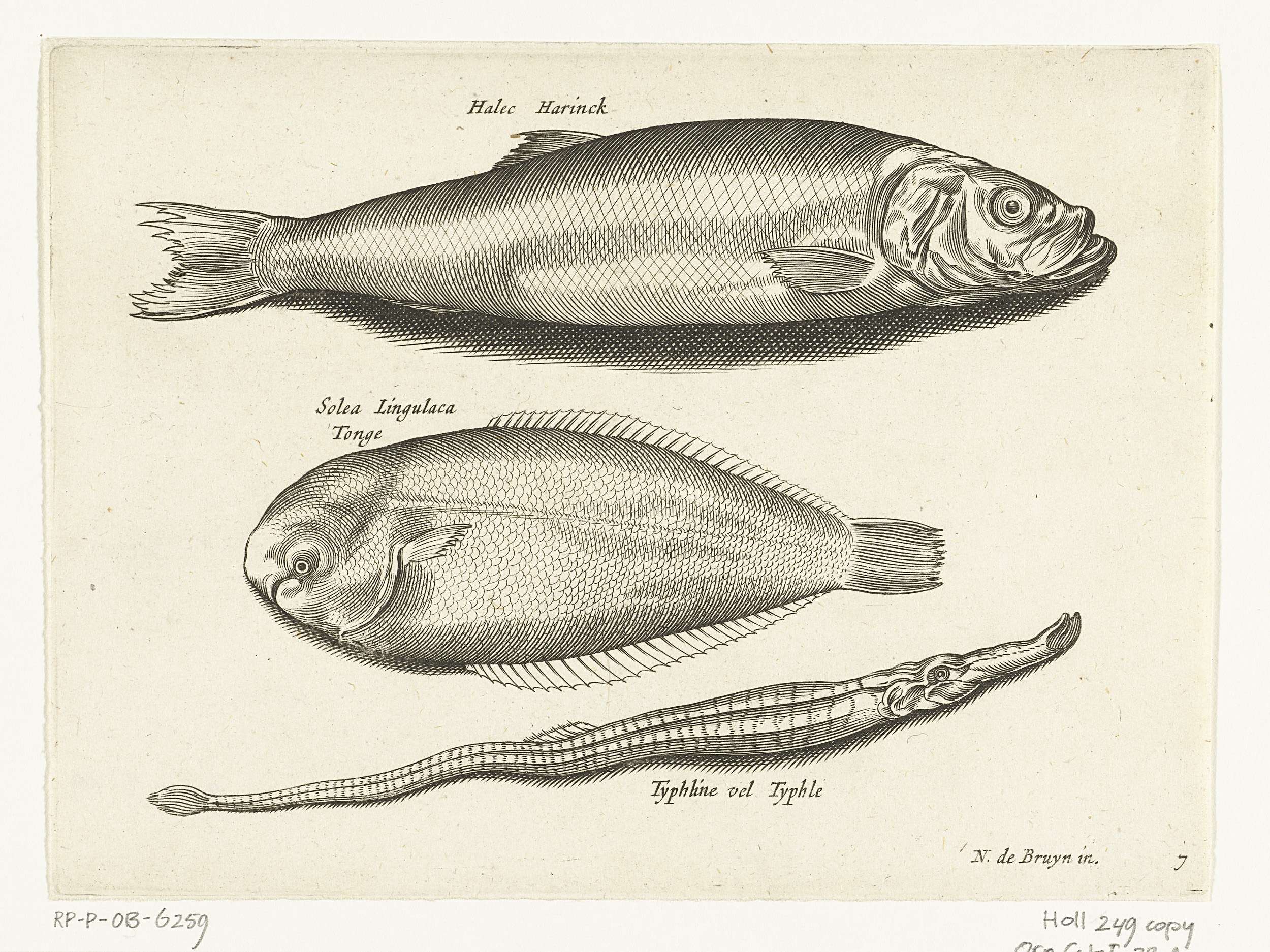 Haring, tong en zeenaald, opschriften identificeren de vissen in Latijn en Nederlands.