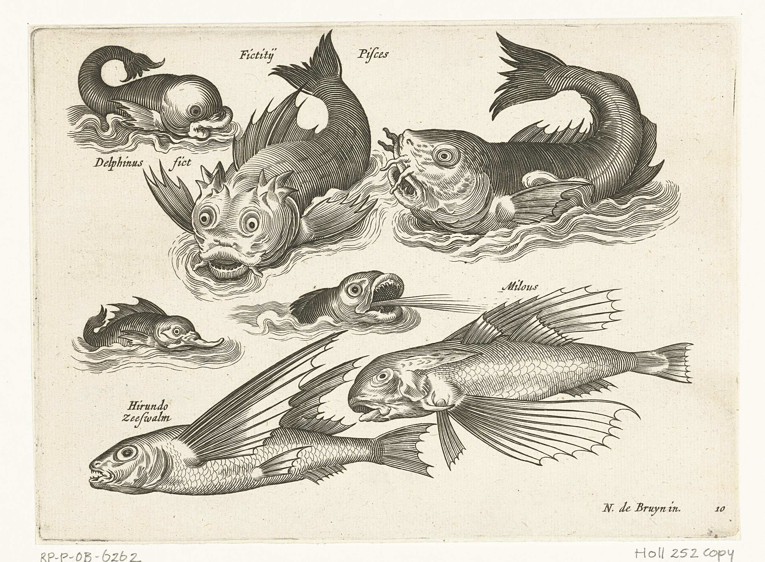 Fantastische waterdieren, opschriften in Latijn en Nederlands identificeren onder andere dolfijn en pitvis.