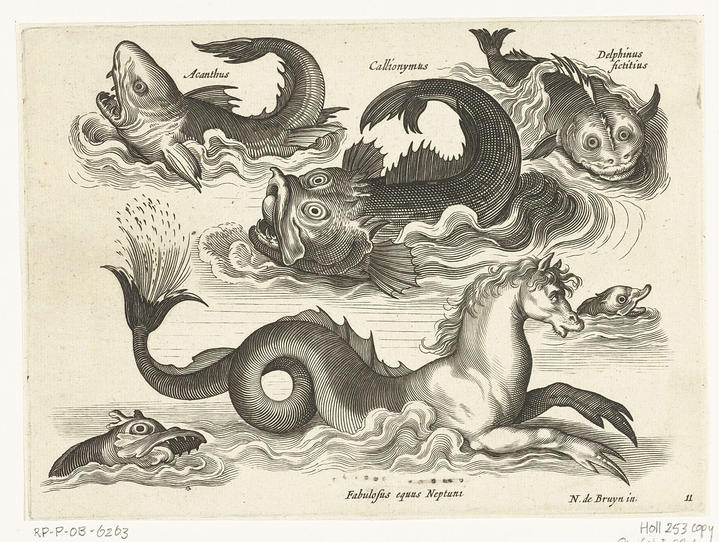 Fantastische waterdieren, onder andere zeepaard met opschriften in Latijn en Nederlands welke de beesten identificeren.