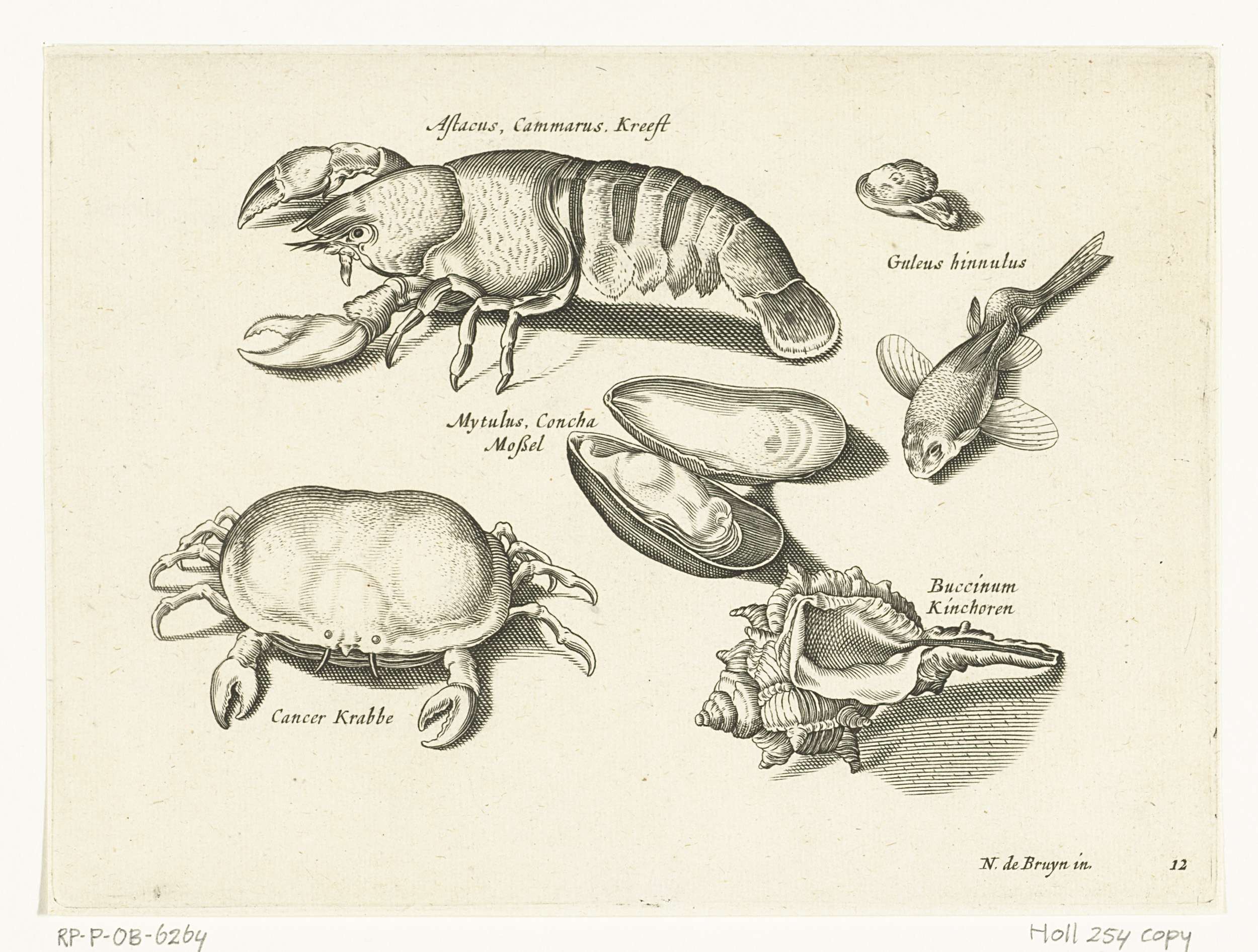 Kreeft, krab en schelpen met opschriften welke de schaaldieren identificeren in Latijn en Nederlands
