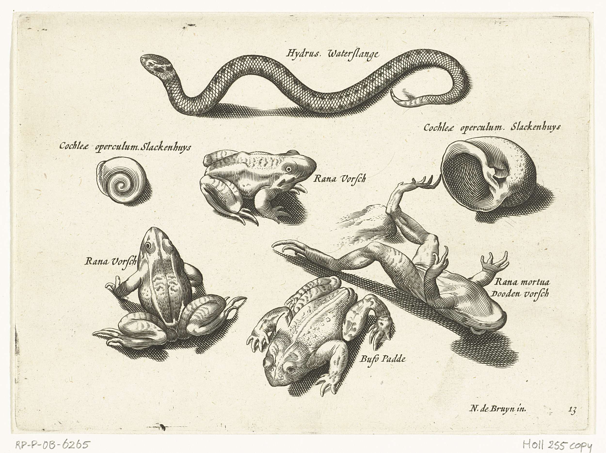 Waterslang, kikkers en padden met opschriften welke deze amfibieën identificeren in Latijn en Nederlands