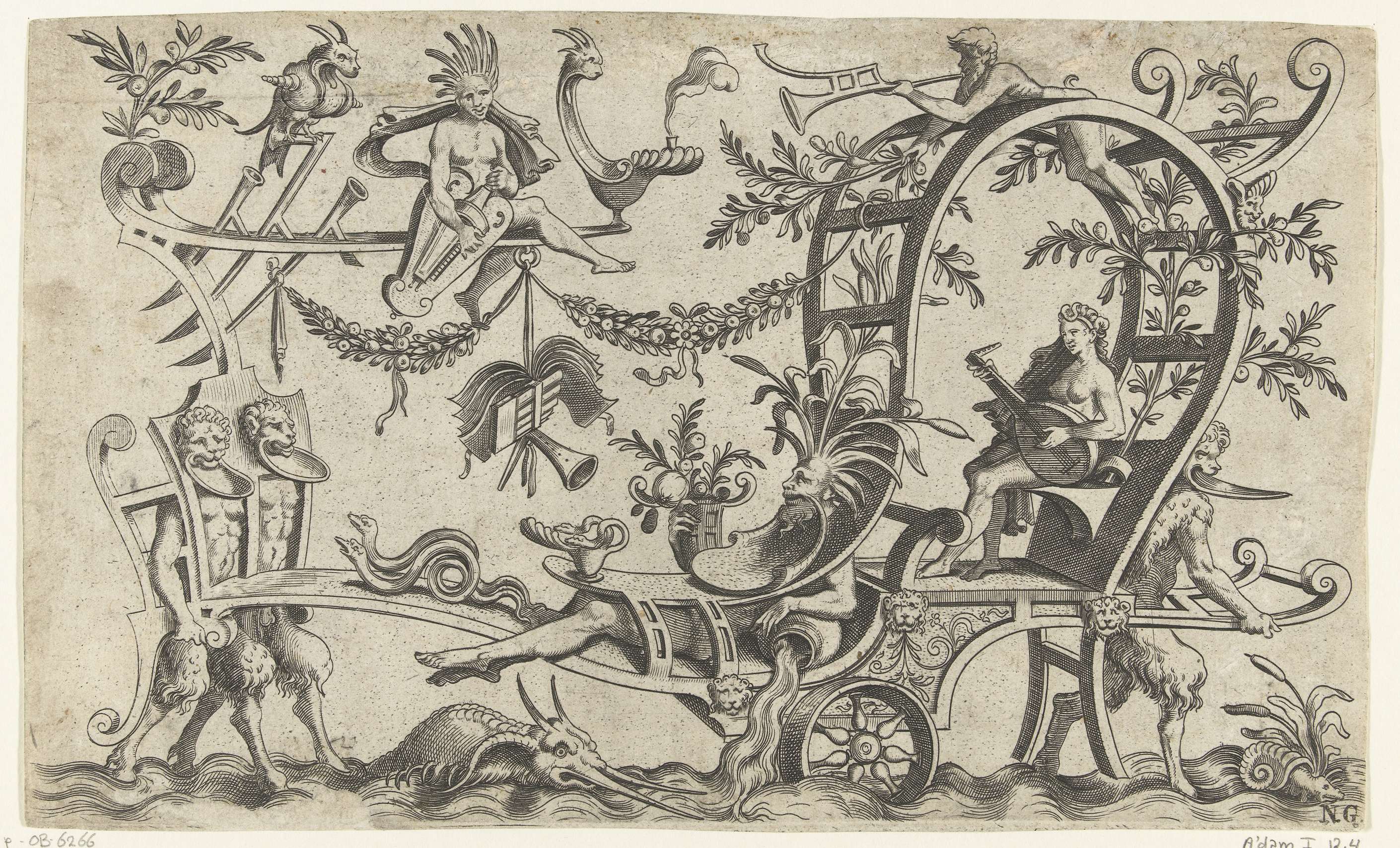 De wagen wordt voorbewogen door drie saters met schotelvormige kinnen. Blad uit serie van 8 bladen met triomfwagens van grotesken en van rolwerk met saters, dieren en diverse andere wezens, gedecoreerd met trofeeëen, guirlandes en bladranken.