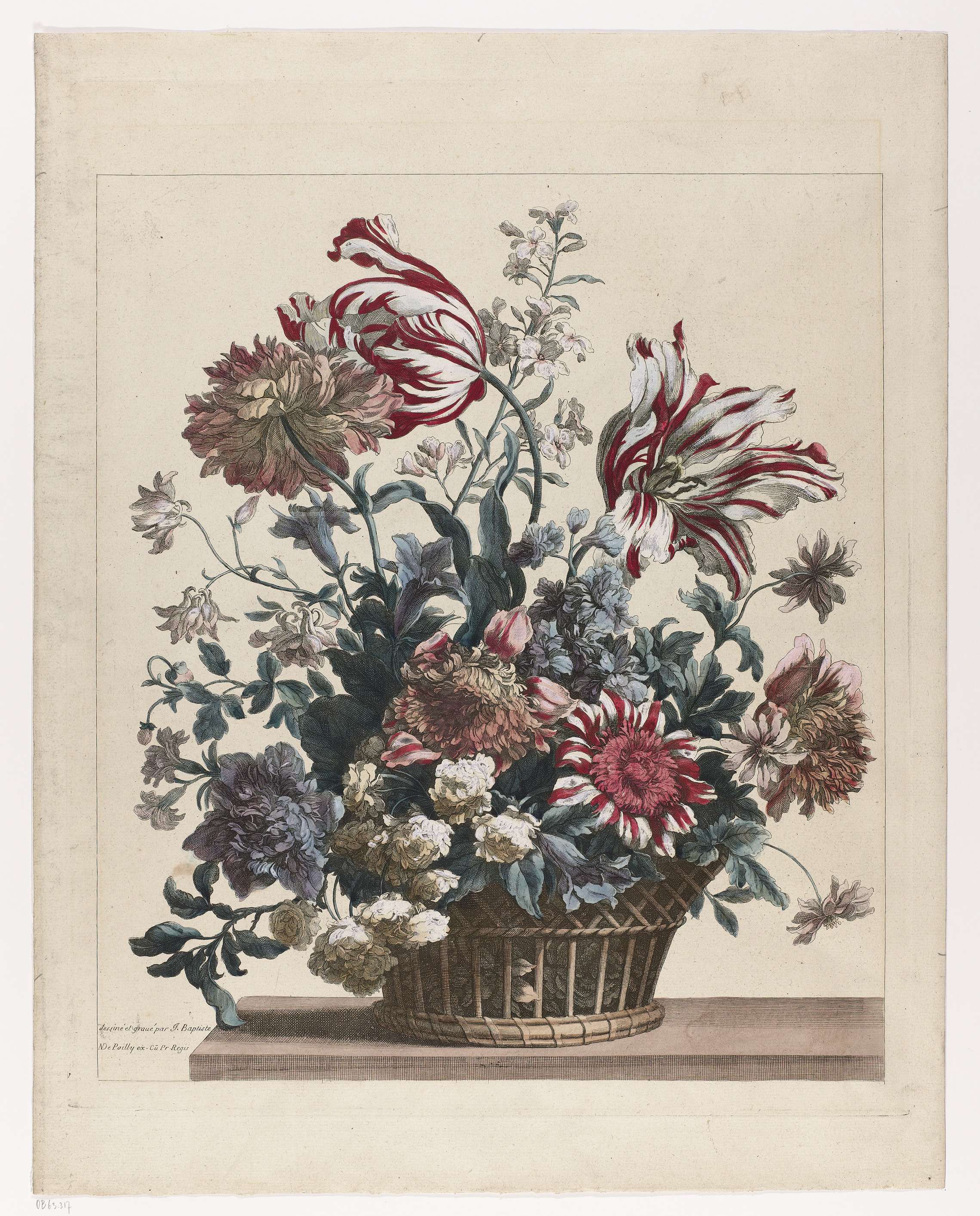 Monnoyer gaf zijn etsen vaak in albums uit, maar zeker niet altijd. Deze fraai ingekleurde prent was bedoeld om ingelijst aan de muur te hangen en vormde een voordelig alternatief voor een schilderij in olieverf. Papier is echter wel kwetsbaar, waardoor veel afdrukken die hebben gehangen verloren zijn gegaan. Een prent als deze is daarom ...