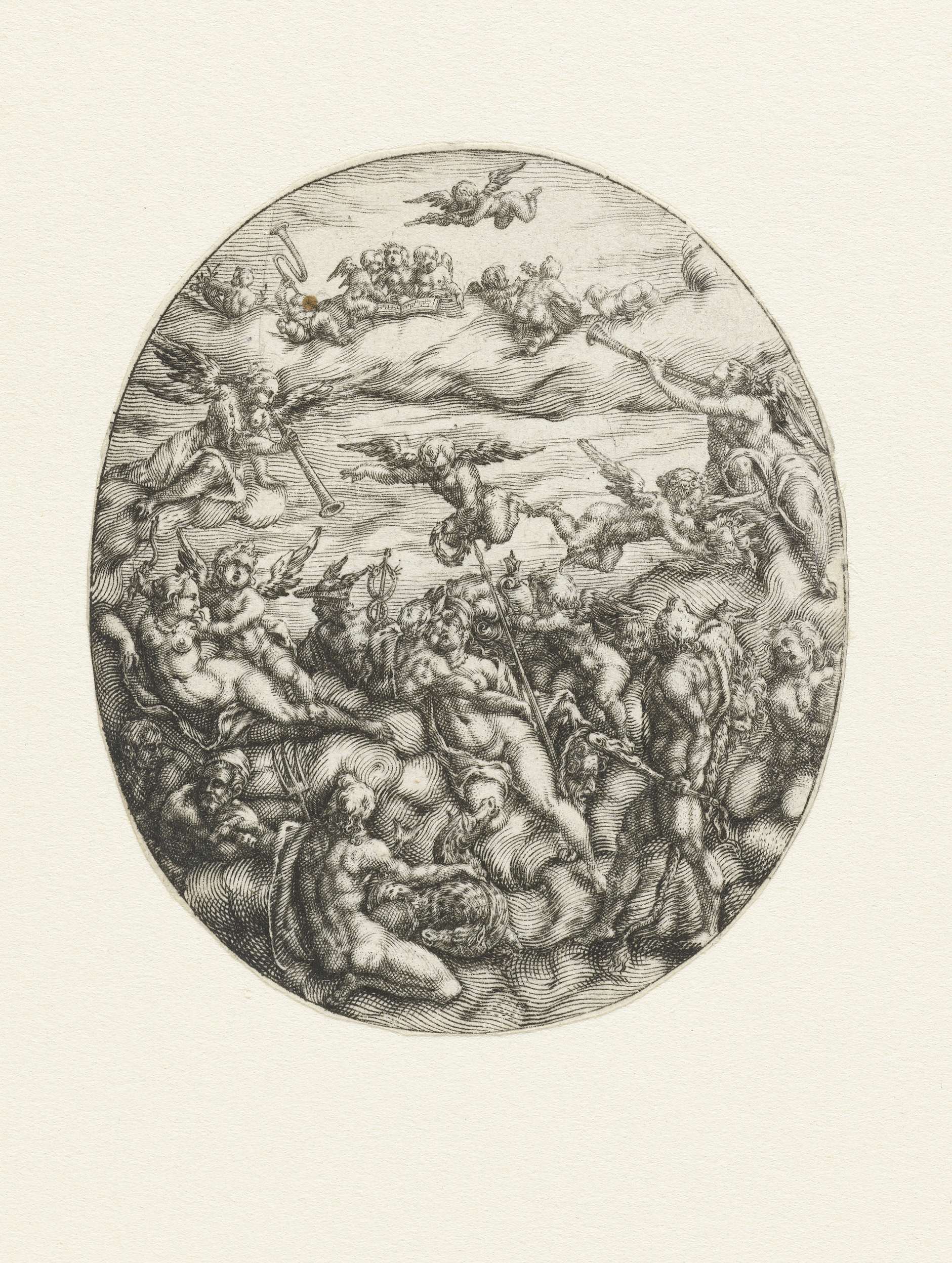 Van links naar rechts: Venus en Amor, Vulcan, Mercurius, Neptunus, Minerva en Hercules. Bovenaan musicerende putti. Blad uit serie bestaande uit een titelblad en 11 bladen met ontwerpen voor horlogedeksels.