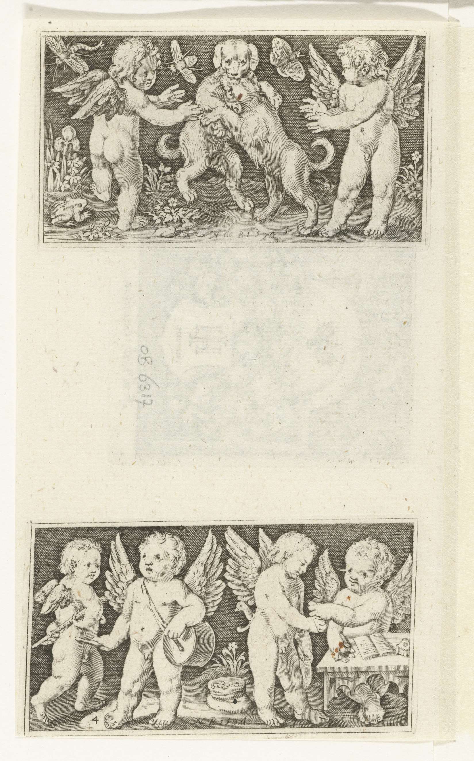 In het bovenste fries staan twee cherubijntjes naast twee honden. In het onderste zijn vier cherubijntjes te zien, waarvan de linker twee met muziekinstrumenten.