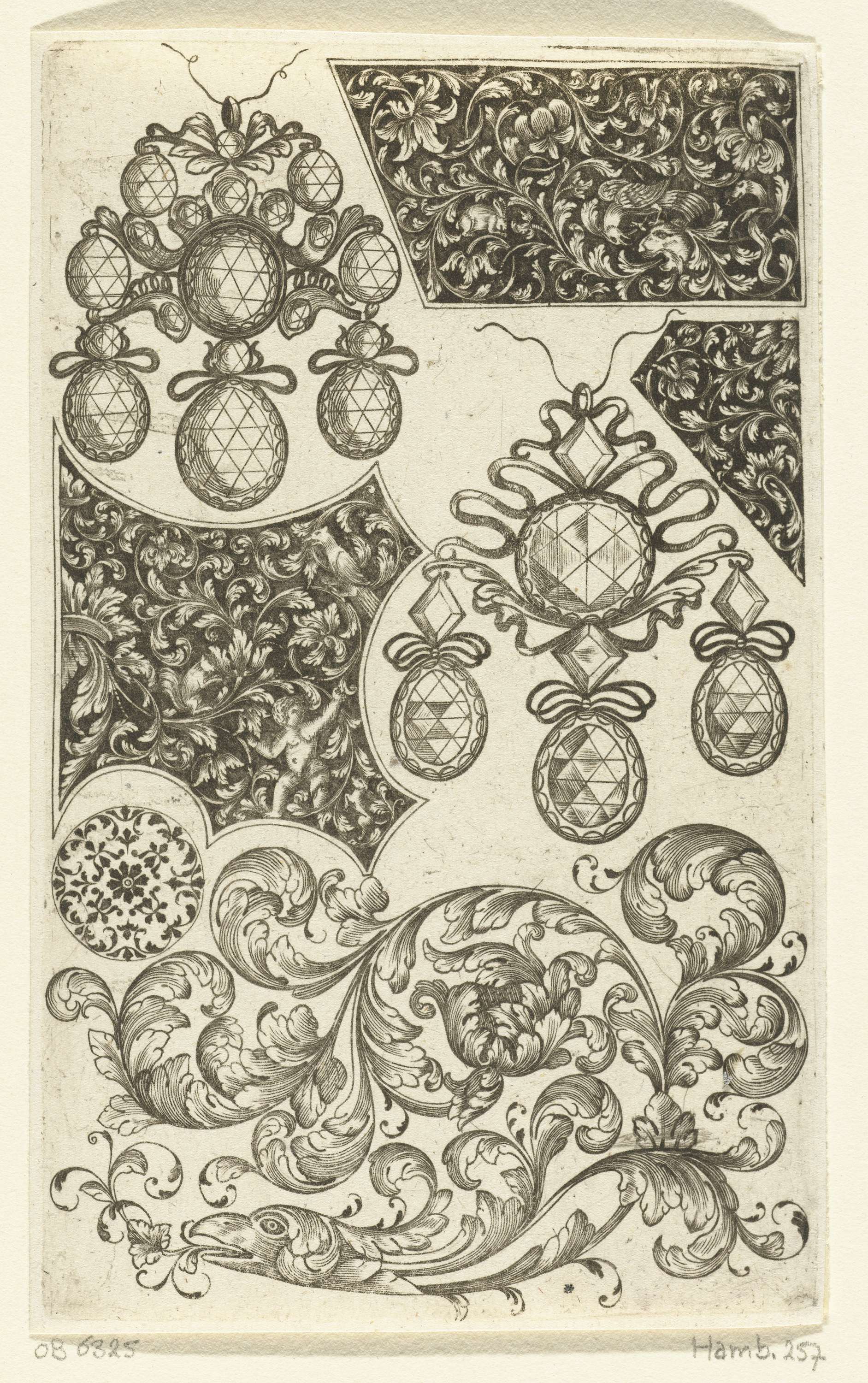 Drie rankornamenten op een zwarte achtergrond, twee hangers en een rankornament op een witte achtergrond. Uit serie bestaande uit een titelblad en 9 bladen.