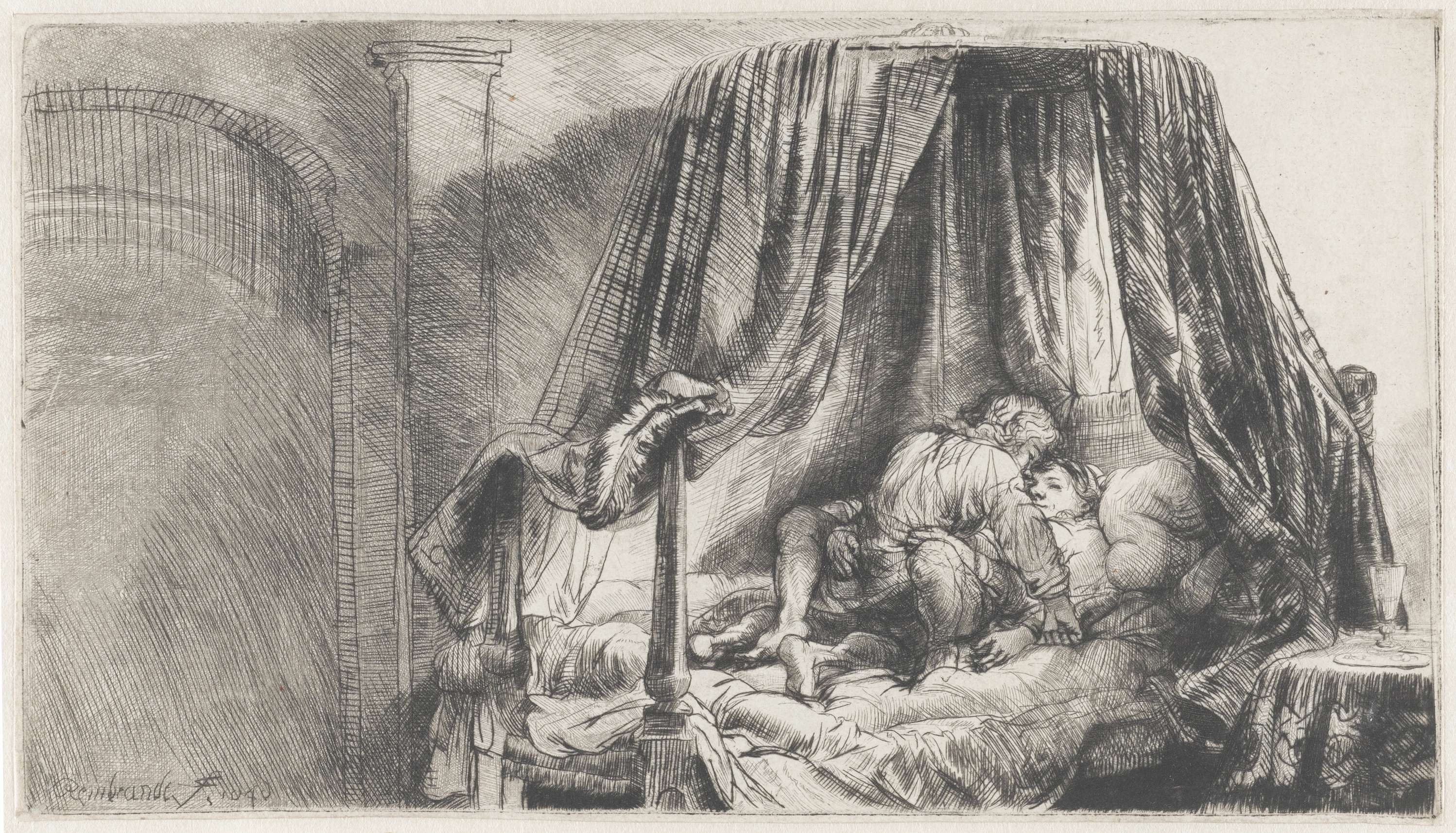 In de 17de eeuw kwamen vaker wulpse voorstellingen voor, maar bijna nooit zo expliciet als op deze prent. Lange tijd bekeek men de ets met afschuw en vooral vanaf de 19de eeuw kon men nietaanvaarden dat Rembrandt dit had gemaakt. Het experimentele karakter spreekt uit een detail op bed: de vrouw heeft twee linkerarmen. Die ...