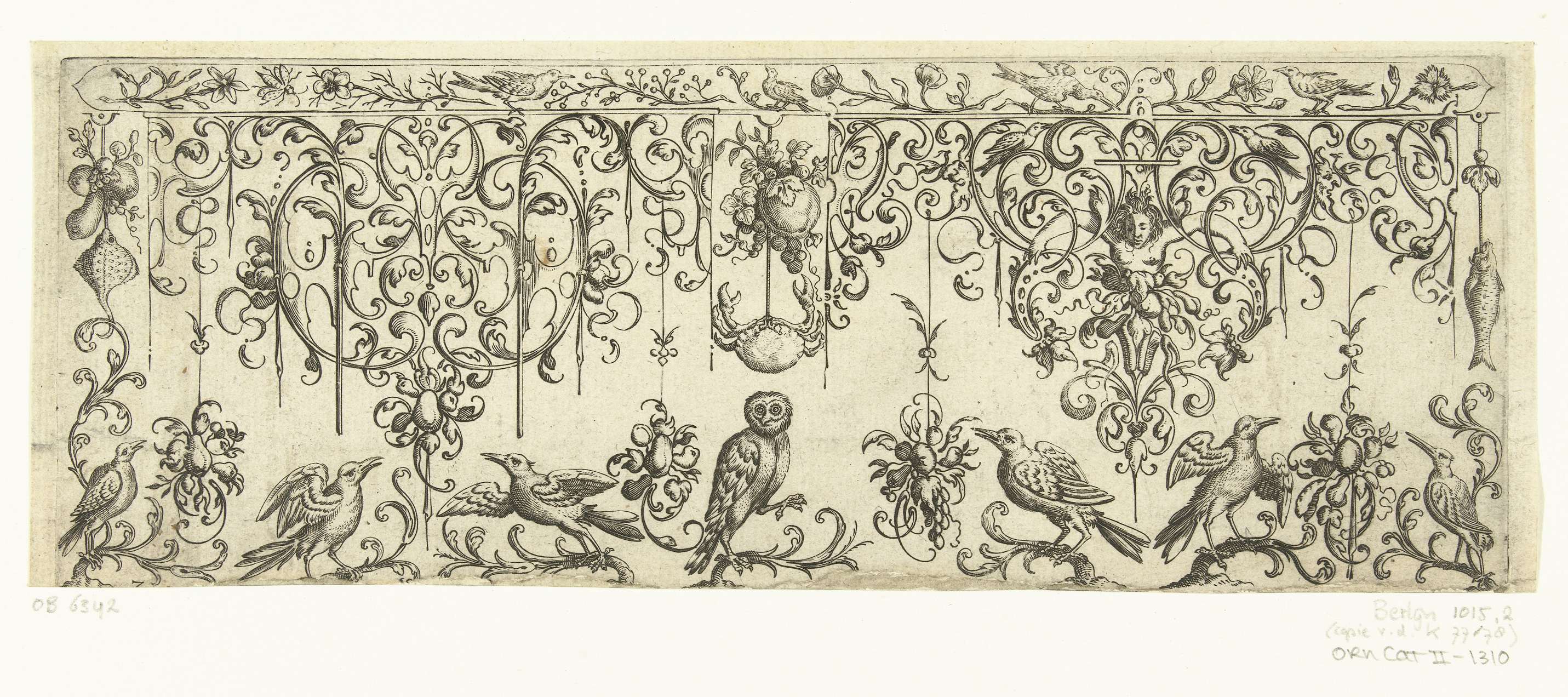 Tegenzijdige kopie naar de bladen 6 en 7 uit de serie Somige Eenvoldige Vruchten en Spitsen. Midden onder zit een uil, daarboven hangt een krab. Uit serie bladen waarop telkens twee motieven naast elkaar te zien zijn, aangevuld met vogels, insecten, bloempotten en soms een ornamentele rand met ranken en dieren.