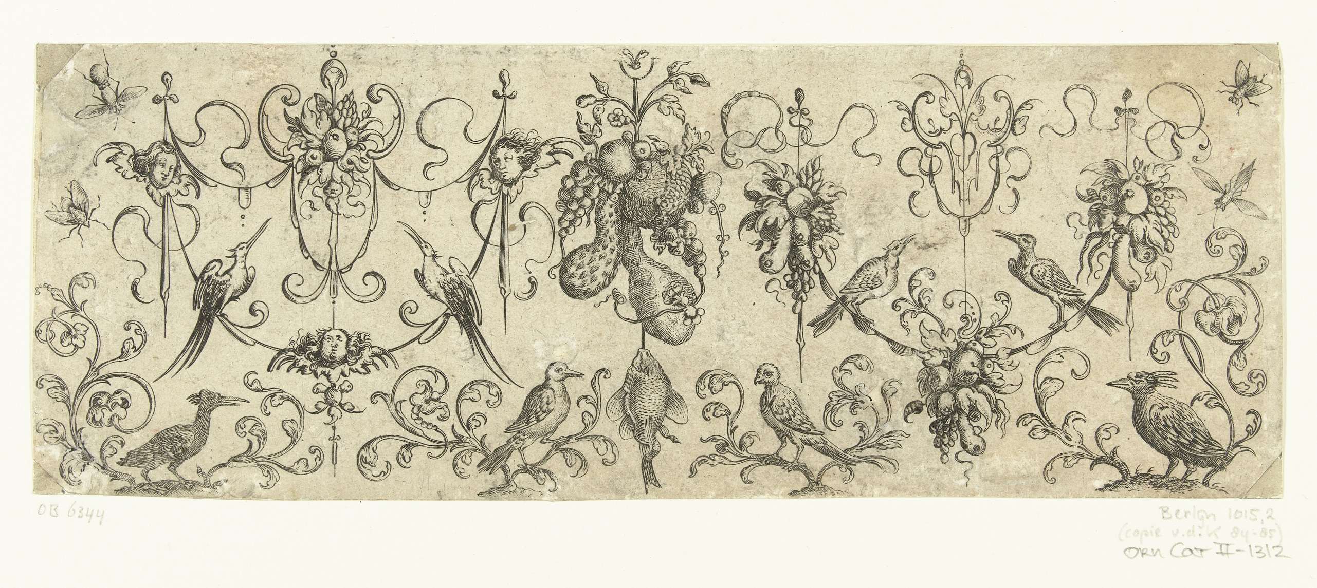 Tegenzijdige kopie naar prenten (blad 13 en 14) uit de serie Somige Eenvoldige Vruchten en Spitsen. Uit serie bladen waarop telkens twee motieven naast elkaar te zien zijn, aangevuld met vogels, insecten, bloempotten en soms een ornamentele rand met ranken en dieren.
