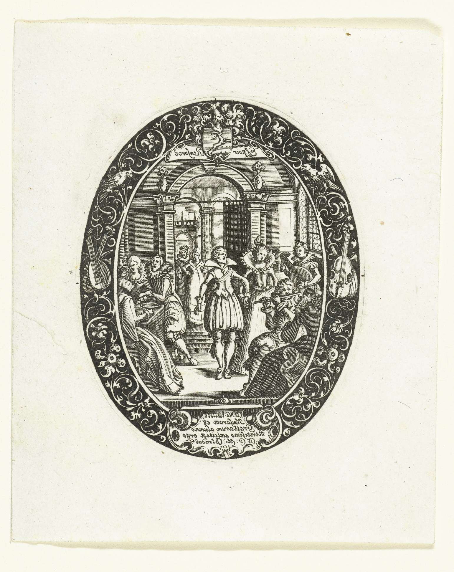 De rand is versierd met ranken, muziekinstrumenten en twee vogels. (waarschijnlijk illustratie in een van de muziekboekjes van Nicolas Vallet)