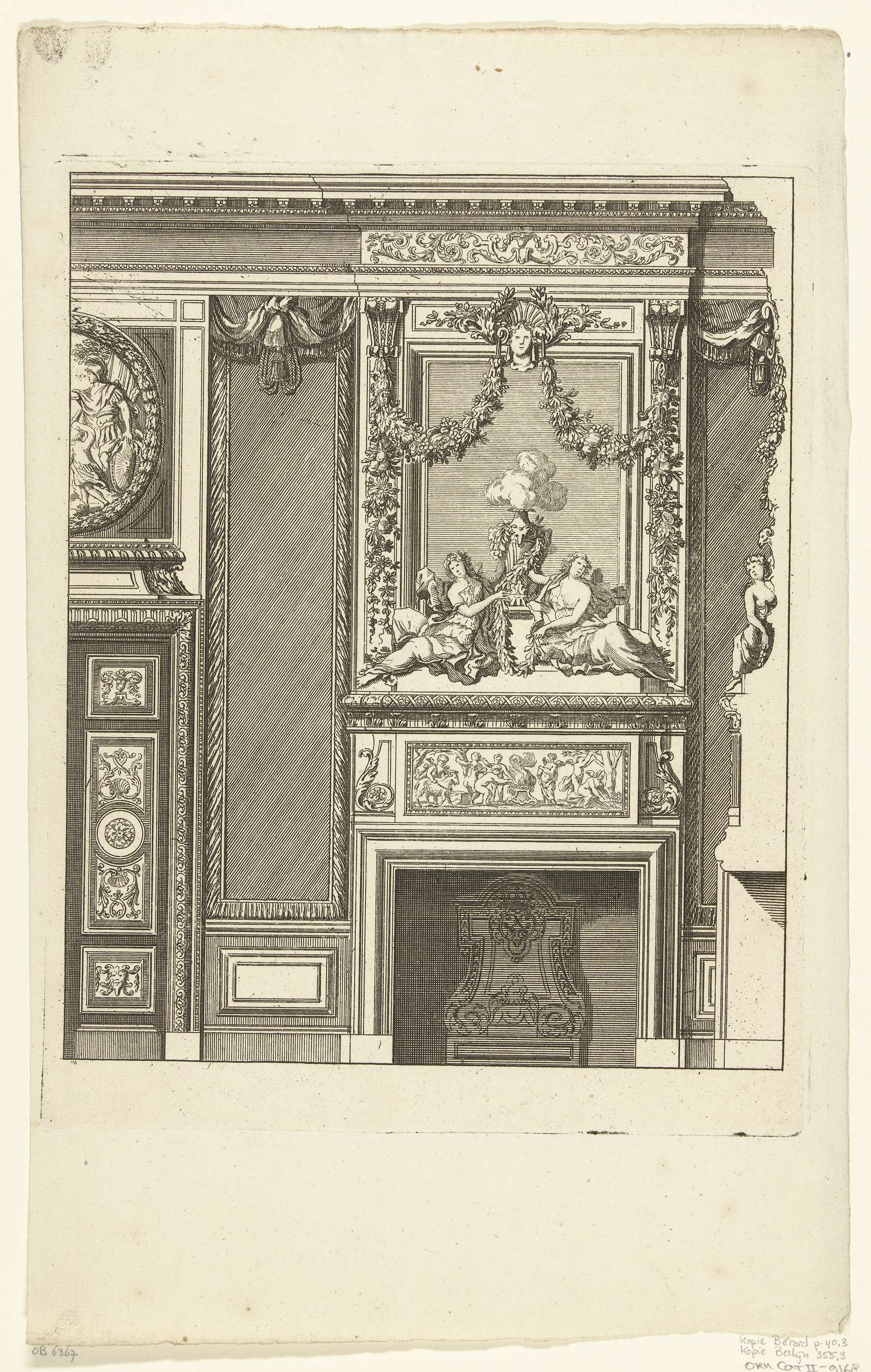 Tussen de schoorsteenboezem en de kroonlijst is een fries afgebeeld met een offerscène in bas-reliëf. Daarboven zitten twee nimfen naast een smeulende urn. Kopie naar prent uit de serie Nouvelles Cheminée faittes en plusieur en droits de la Hollande et autres Prouinces.