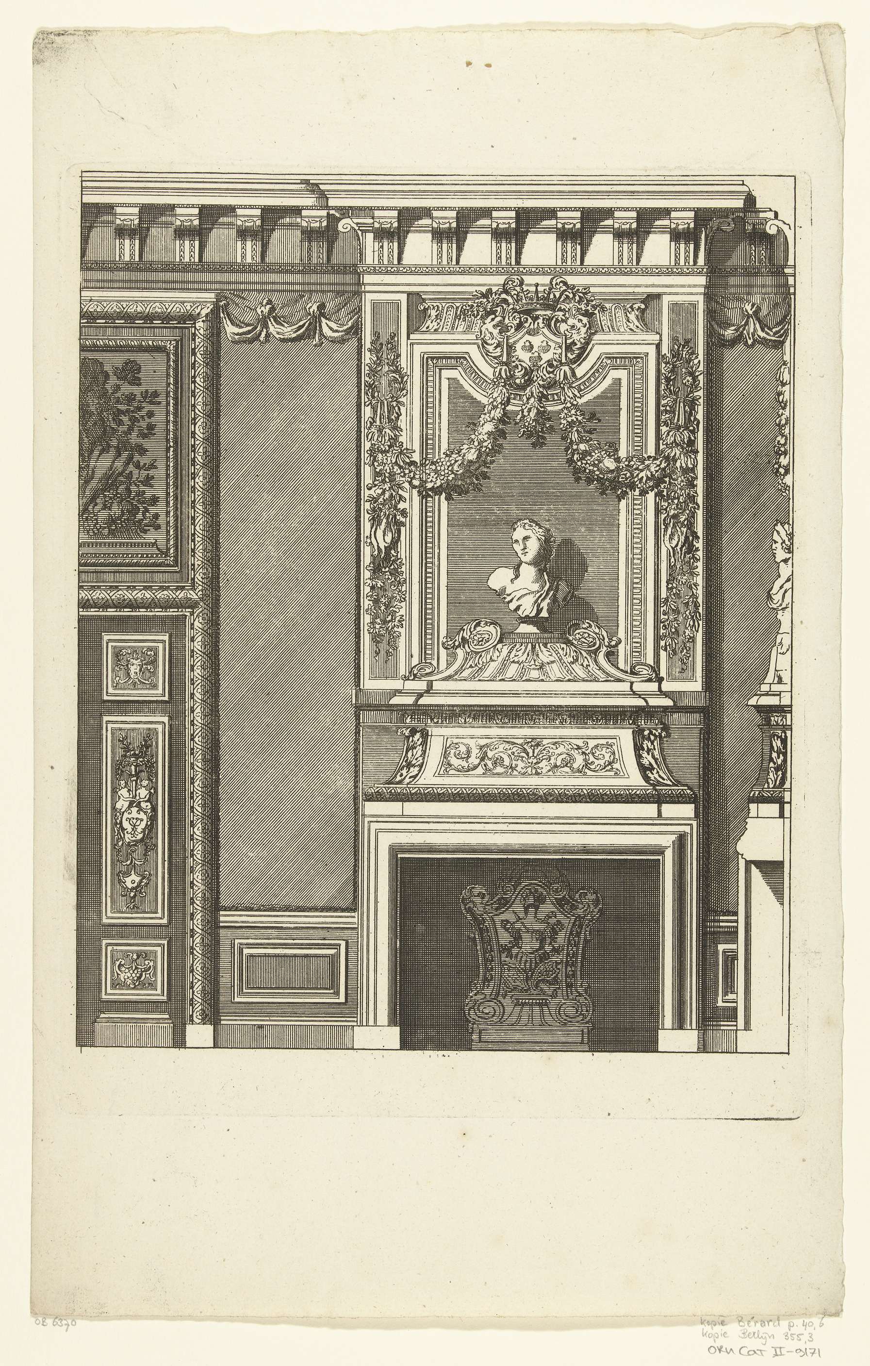 De schoorsteenmantel is gedecoreerd met een buste. Links is een halve deur zichtbaar met een bovendeurspaneel. Kopie naar prent uit de serie Nouvelles Cheminée faittes en plusieur en droits de la Hollande et autres Prouinces.
