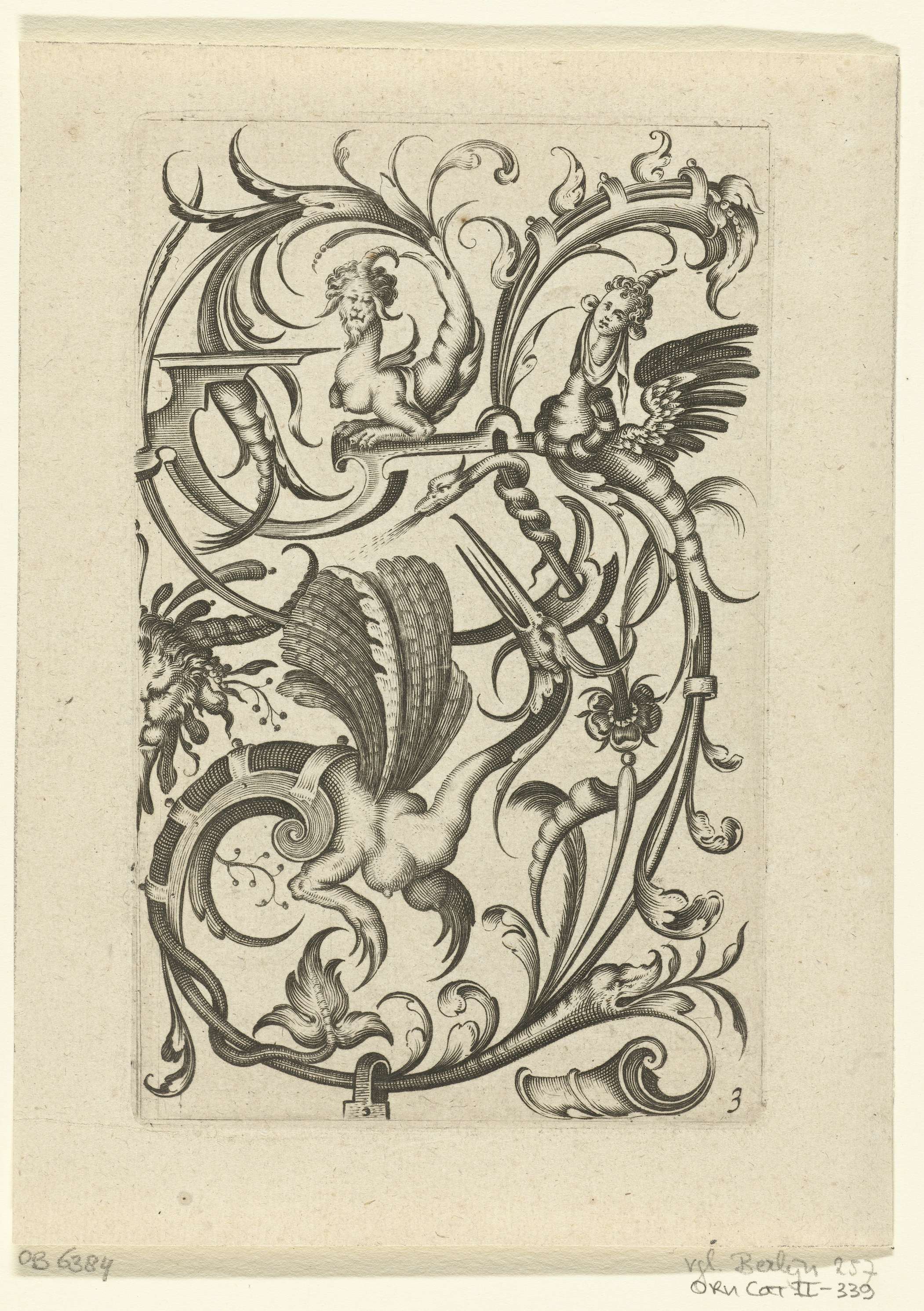 Paneel met bladranken die uitlopen in drie groteske monsters