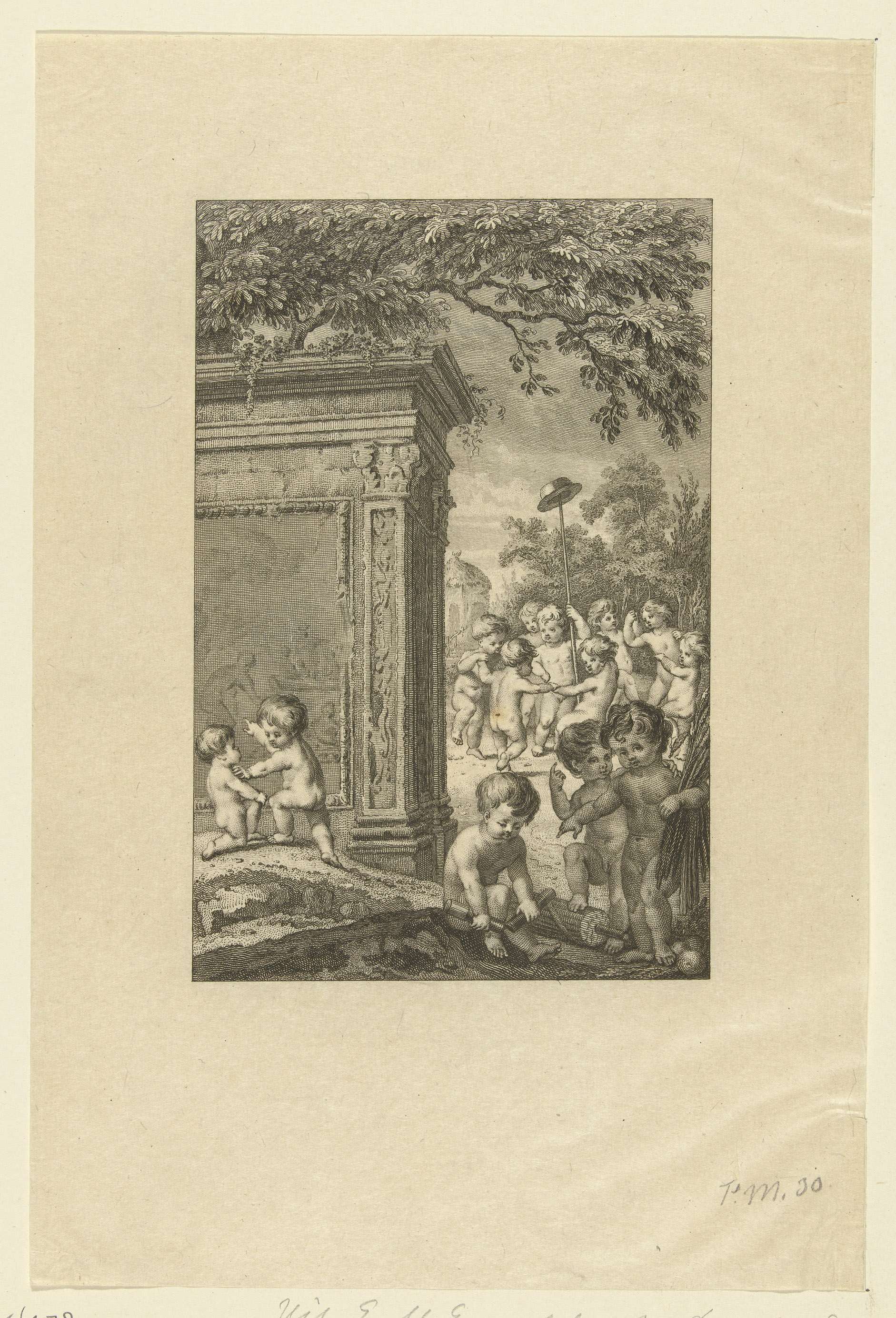 Ontwerp voor titelblad voor: Aloude Staat der Verenigde Nederlanden. Spelende putti bij een ruïne en dansend rond de vrijheidshoed op een stok.