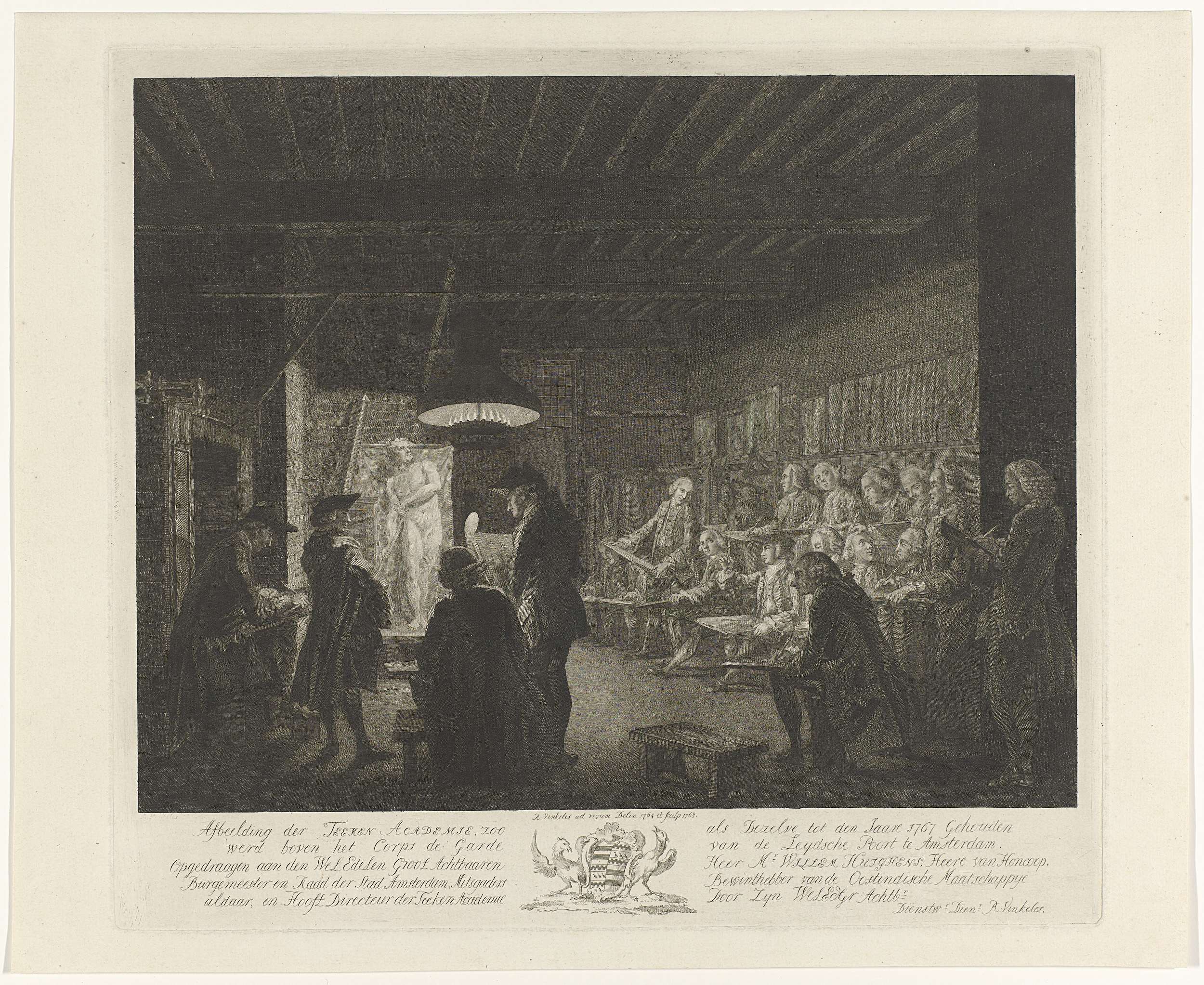 De stadstekenacademie (Teeken-Academie) boven het Corps de Garde in de Leidsepoort te Amsterdam in het jaar 1764. De tekenacademie verhuisde op 4 december 1767 naar het stadhuis op de Dam. Een groep mannelijke tekenleerlingen in een vrij donker interieur bij lamplicht tekenend naar een mannelijk naaktmodel, het model staand van voren gezien. In de marge ...