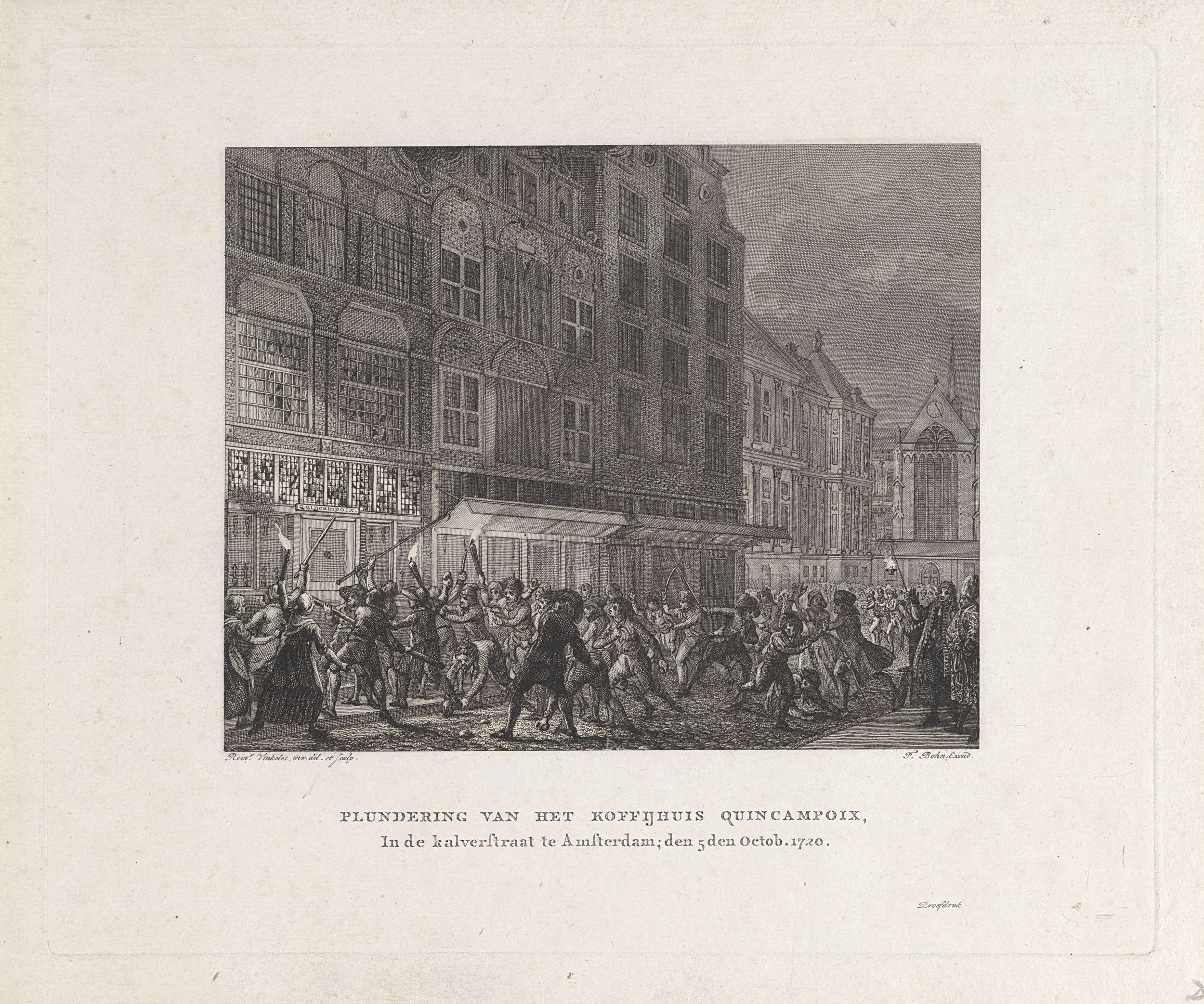 Nachtelijke plundering door een oproerige menigte van het koffiehuis Quincampoix in de Kalverstraat te Amsterdam waar veel windhandel gedreven werd, 5 oktober 1720.