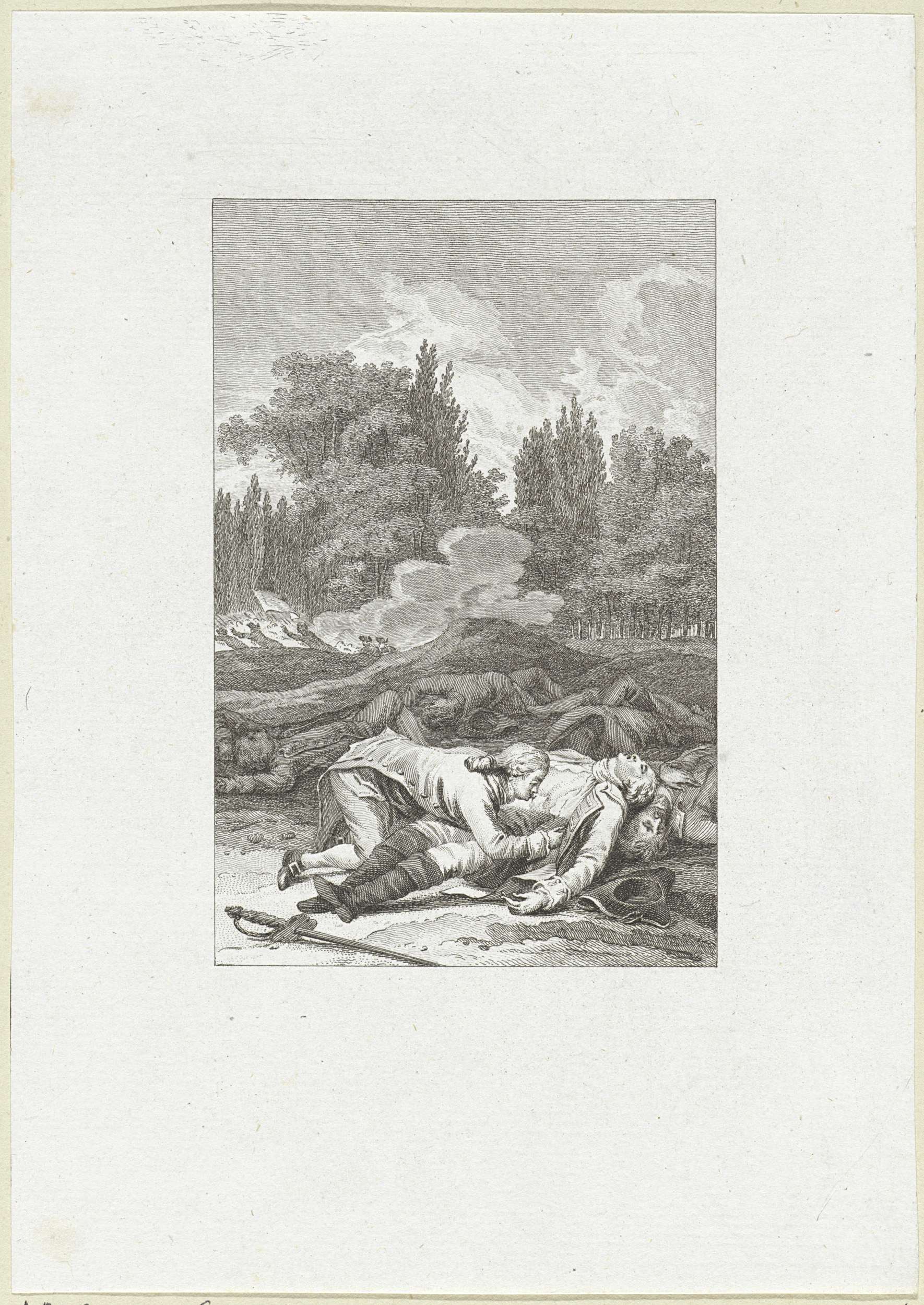 Slagveld in een bos met een man die zijn hoofd op de borst van een gesneuvelde soldaat legt
