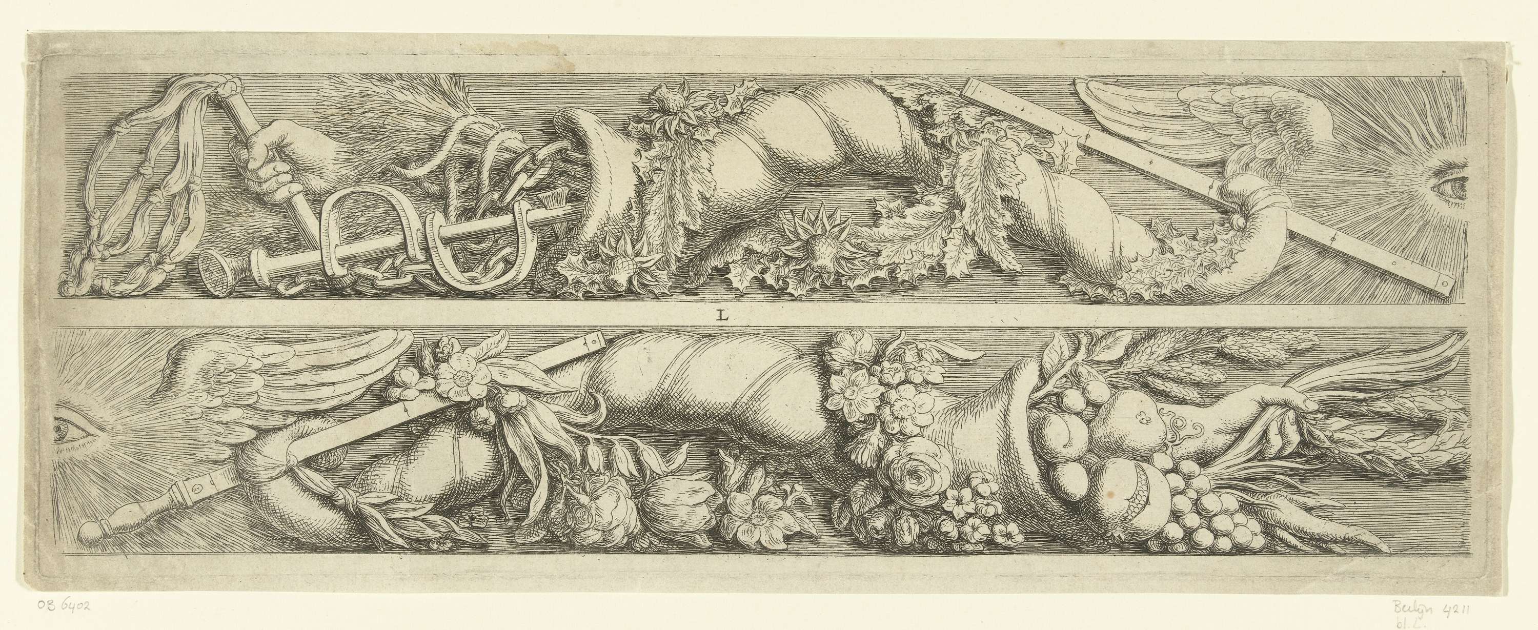 Fries met aan de bovenzijde een hoorn met strafwerktuigen en aan de onderzijde een hoorn des overvloeds. Rechtsboven en linksonder het Alziend Oog. Midden L genummerd.