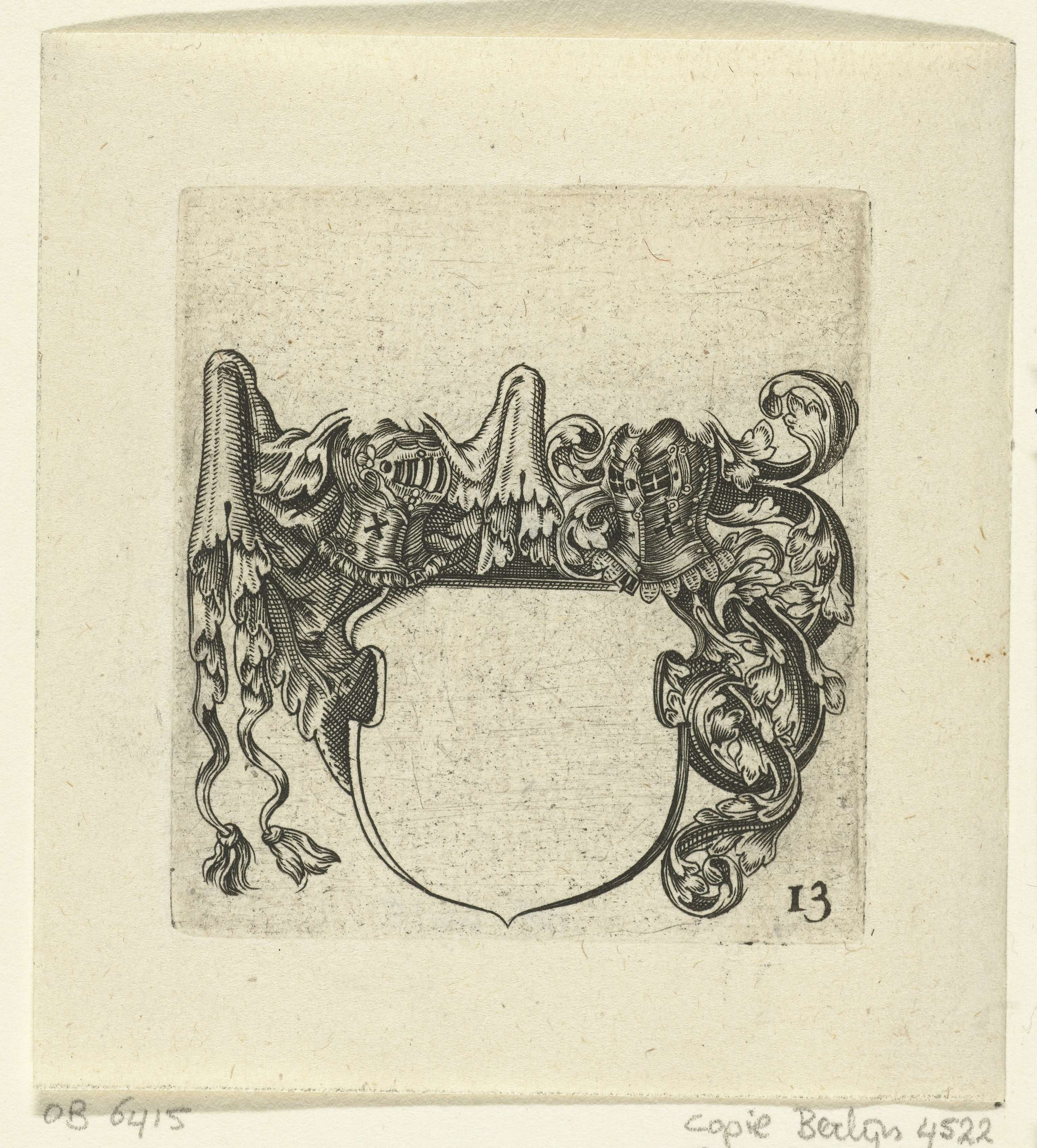 Aan de linkerkant hangt een draperie, aan de rechterkant hangen twee bladranken. Tegenzijdige kopie naar wapenschild van Theodor de Bry in het boek Emblemata Nobilitati.... Blad uit serie wapenschilden met lege compartimenten.