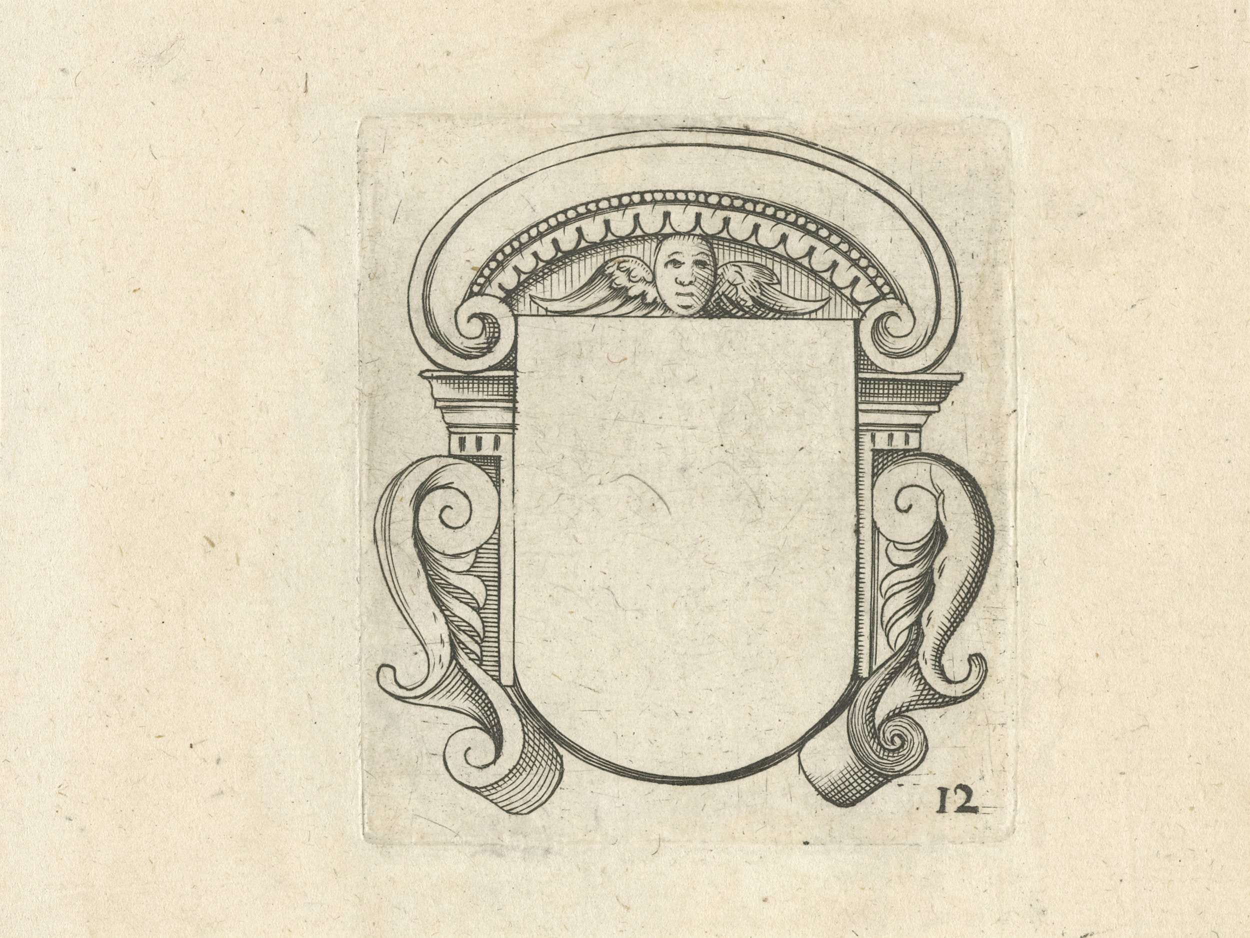Met aan beide kanten een console. Blad uit serie wapenschilden met lege compartimenten.