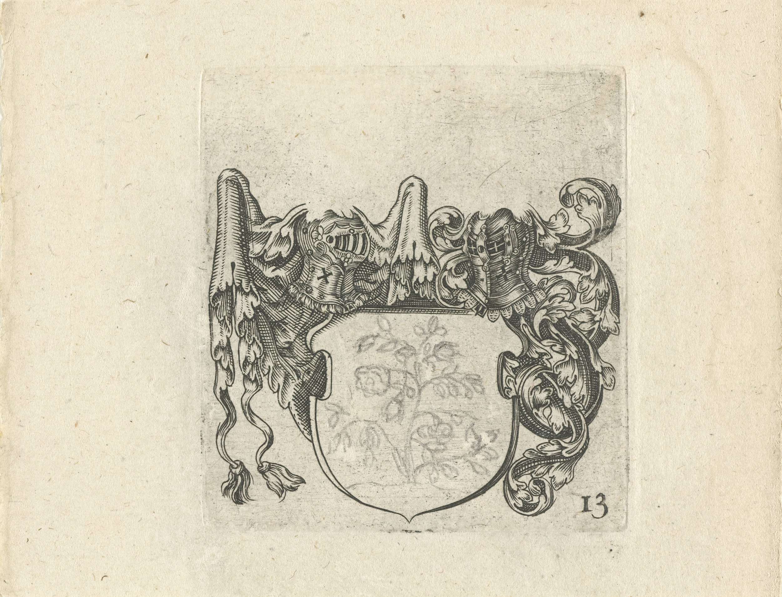 Aan de linkerkant hangt een draperie, aan de rechterkant hangen twee bladranken. In het schild is met potlood een plant met bloemen getekend.Tegenzijdige kopie naar wapenschild van Theodor de Bry in het boek Emblemata Nobilitati.... Blad uit serie wapenschilden met lege compartimenten.