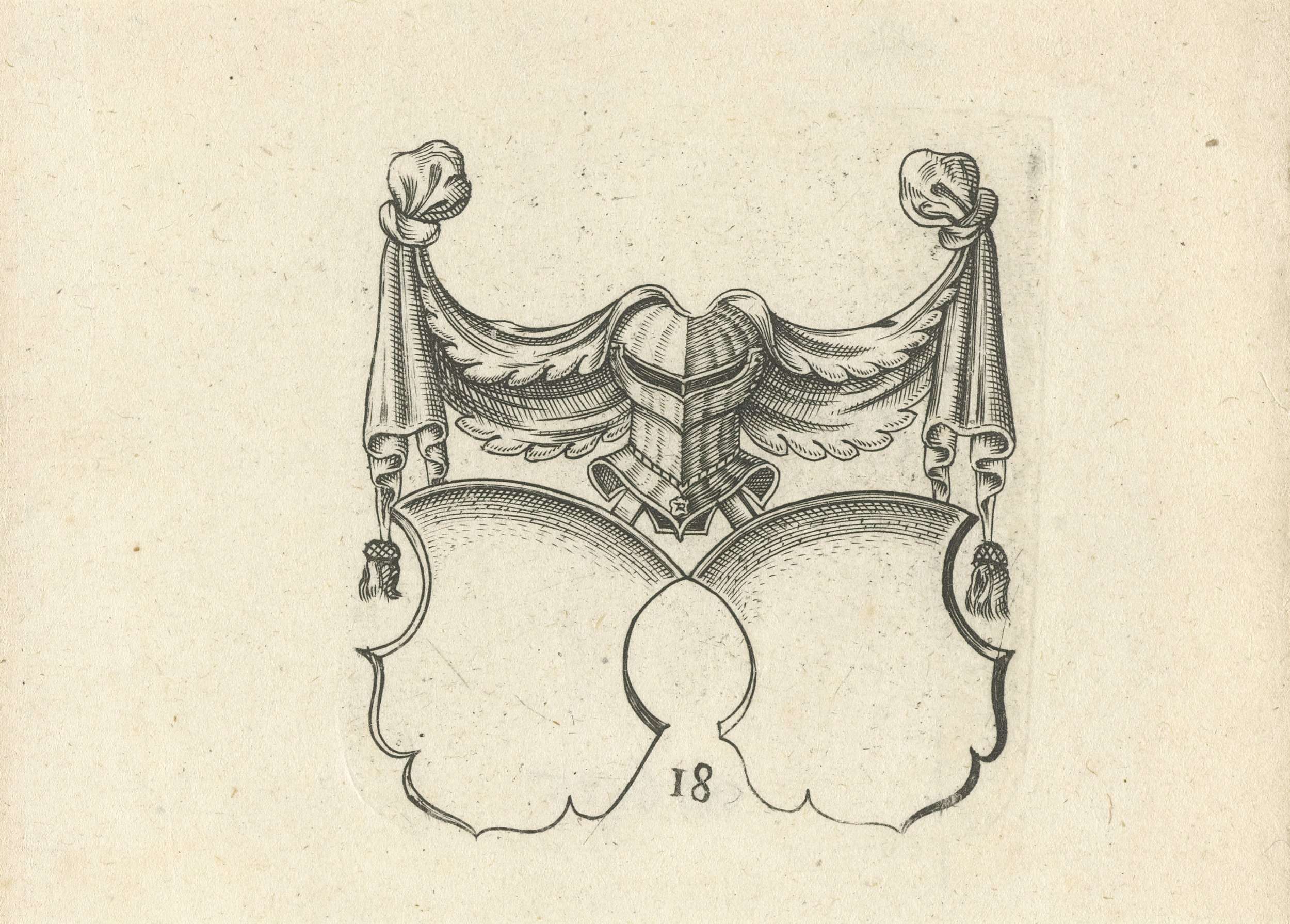 Erboven staat een helm met aan beide kanten een draperie. Tegenzijdige kopie naar wapenschilden van Theodor de Bry in het boek Emblemata Nobilitati.... Blad uit serie wapenschilden met lege compartimenten.