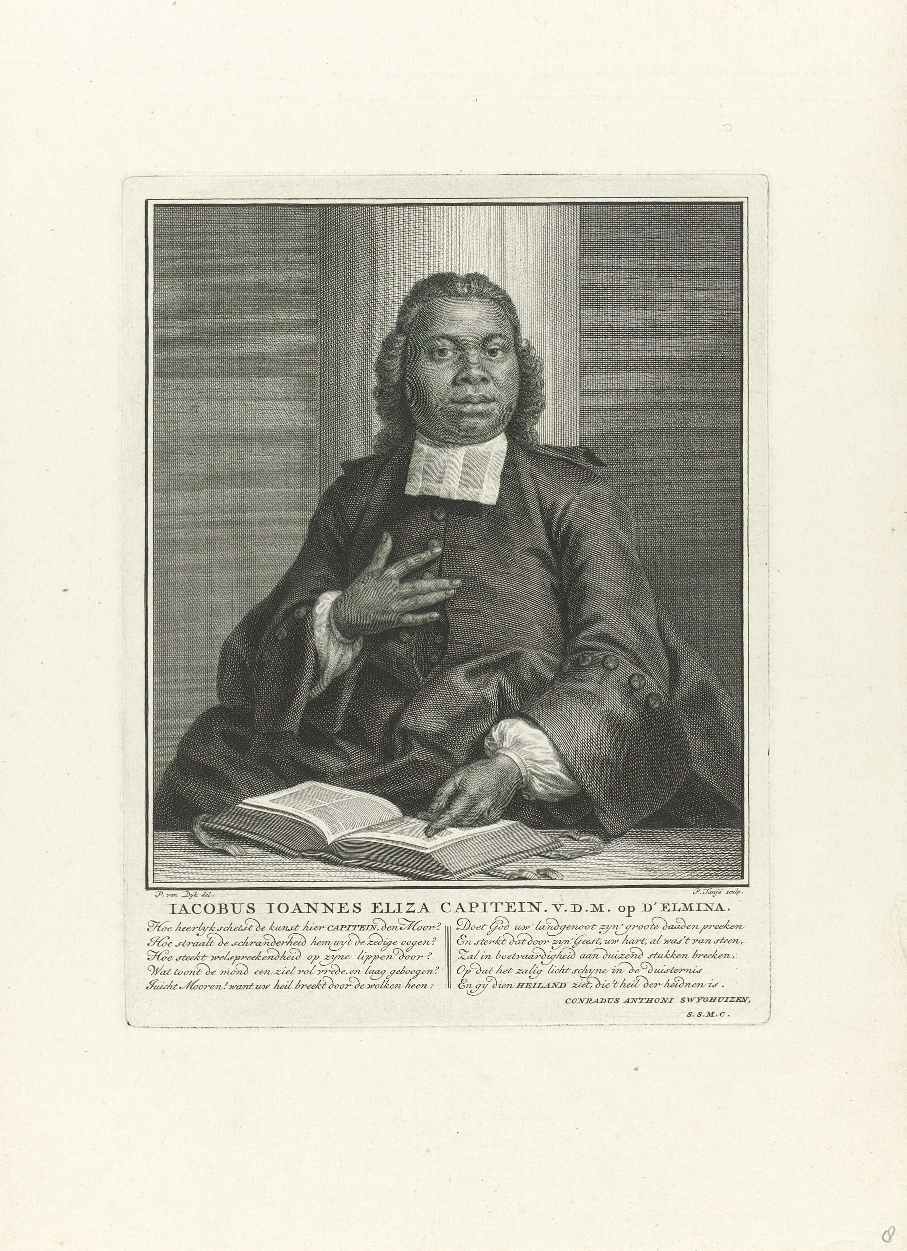 Portret van Jacobus Elisa Johannes Capitein, de eerste zwarte in Nederland opgeleide predikant, met zijn hand op de Bijbel. Hij was predikant in Fort Elmina, in zijn vaderland, het huidige Ghana.