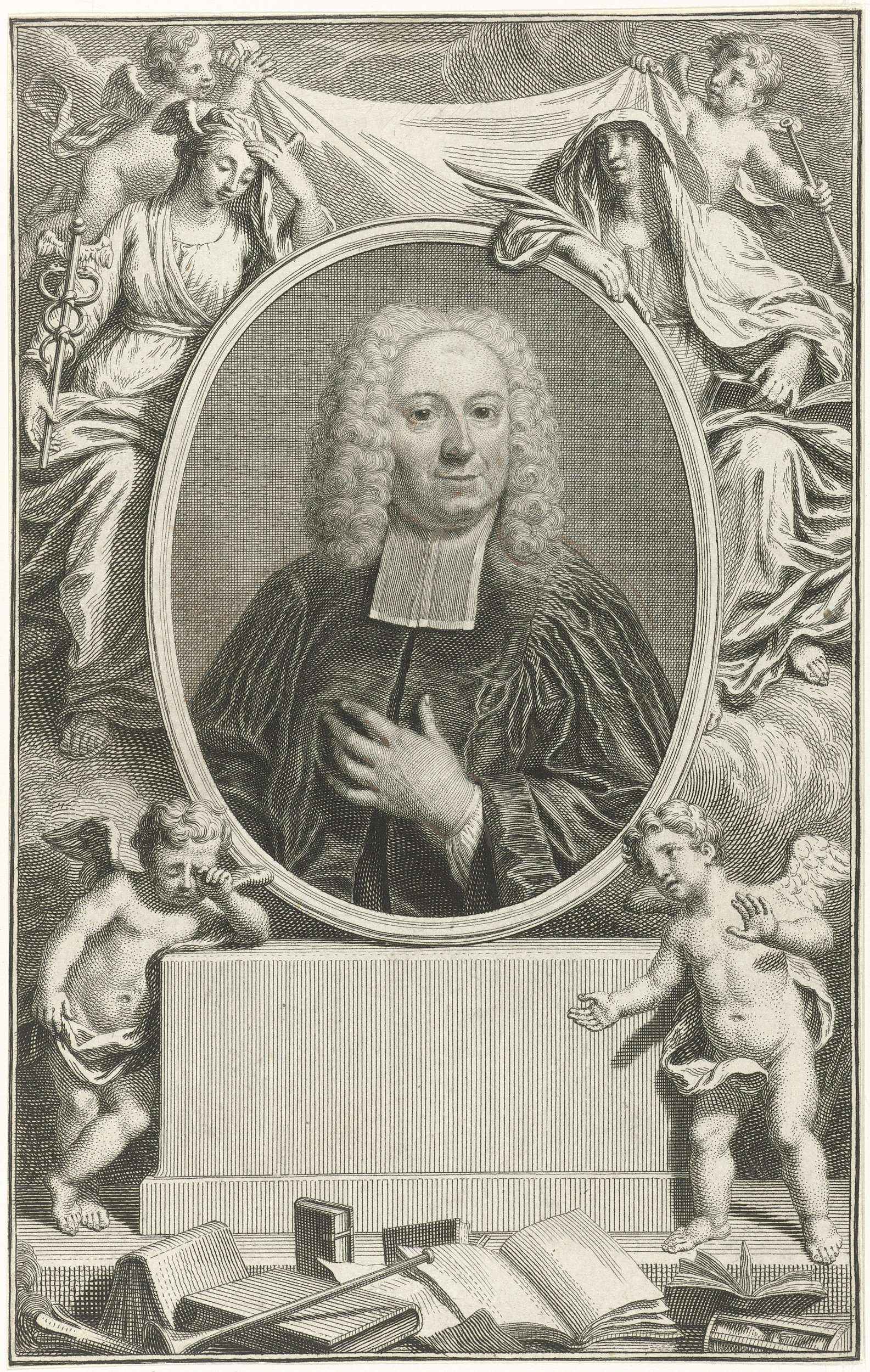 Portret van Henri Châtelain, predikant van de Waalse Kerk te Den Haag en Amsterdam. Het portret wordt omgeven door allegorische figuren. Boven flankeren de Vrede, met caduceus en petasus, en het Geloof, met kruis, de lijst. Bij het piedestal een treurende putto en een putto, die op boeken, een gedoofde toorts en een zandloper wijst.