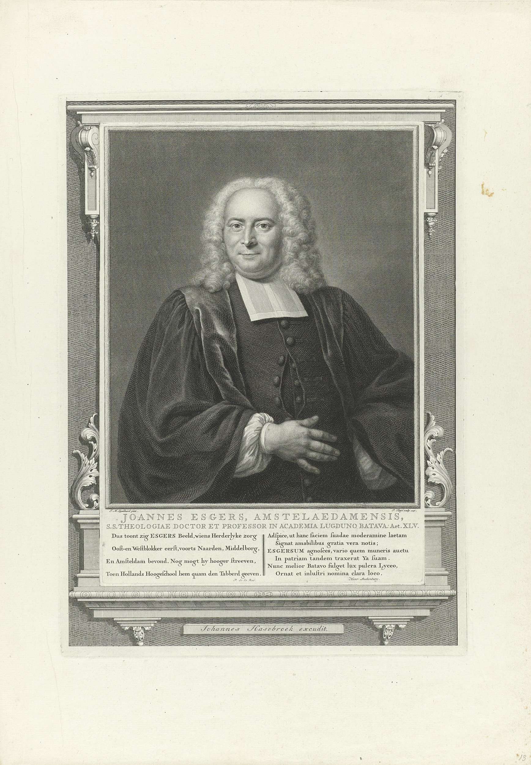 Portret van Johannes Esgers. Hij was achtereenvolgens predikant te Ooster- en Westerblokker, Naarden, Middelburg en Amsterdam en tot slot hoogleraar te Leiden. Onder het portret een vierregelig vers in het Nederlands en het Latijn. Het portret en de tekst zijn gevat in een ornamentele randlijst.