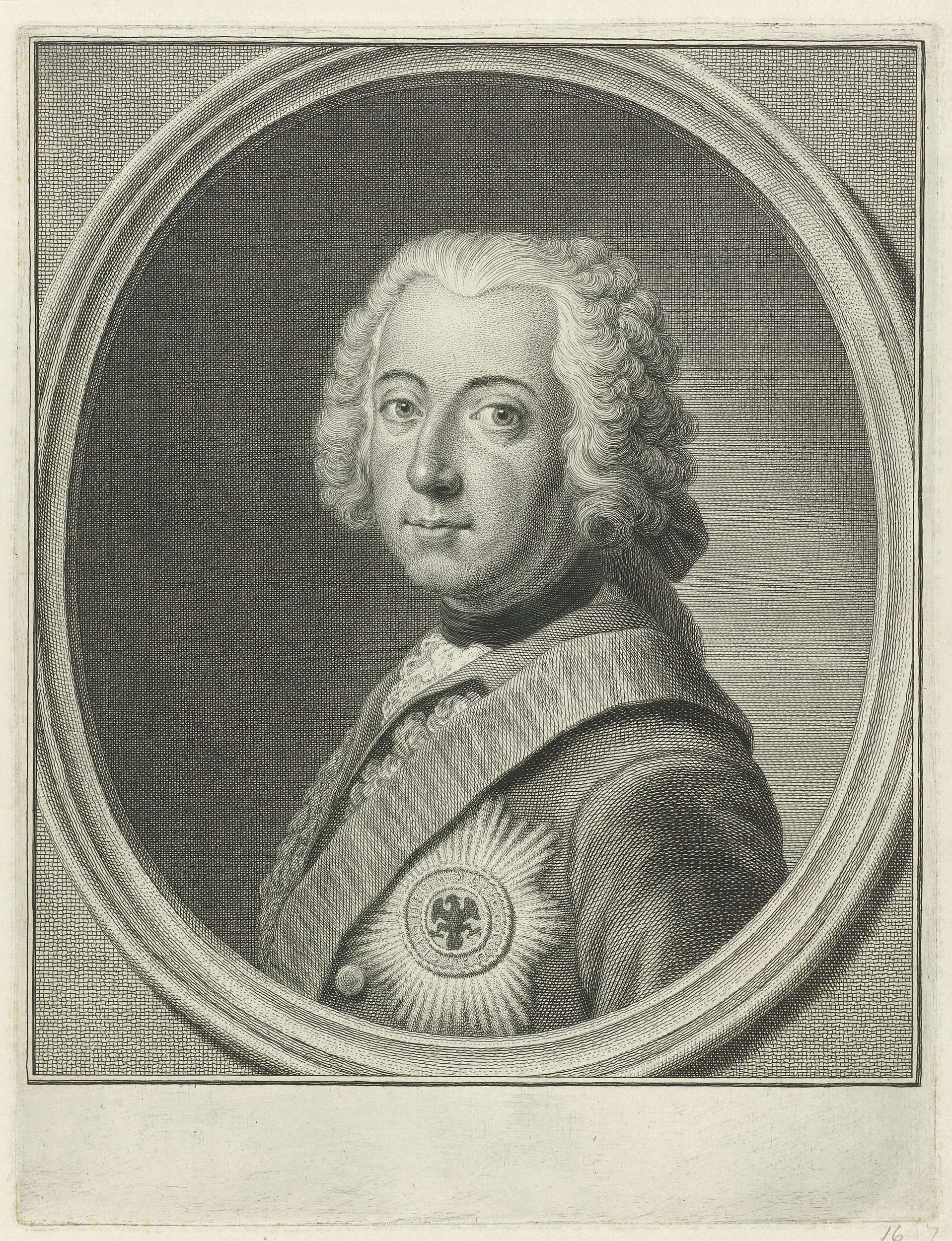 Portret van Frederik II de Grote, koning van Pruisen. Op zijn borst het ordeteken van de Hoge Orde van de Zwarte Adelaar.