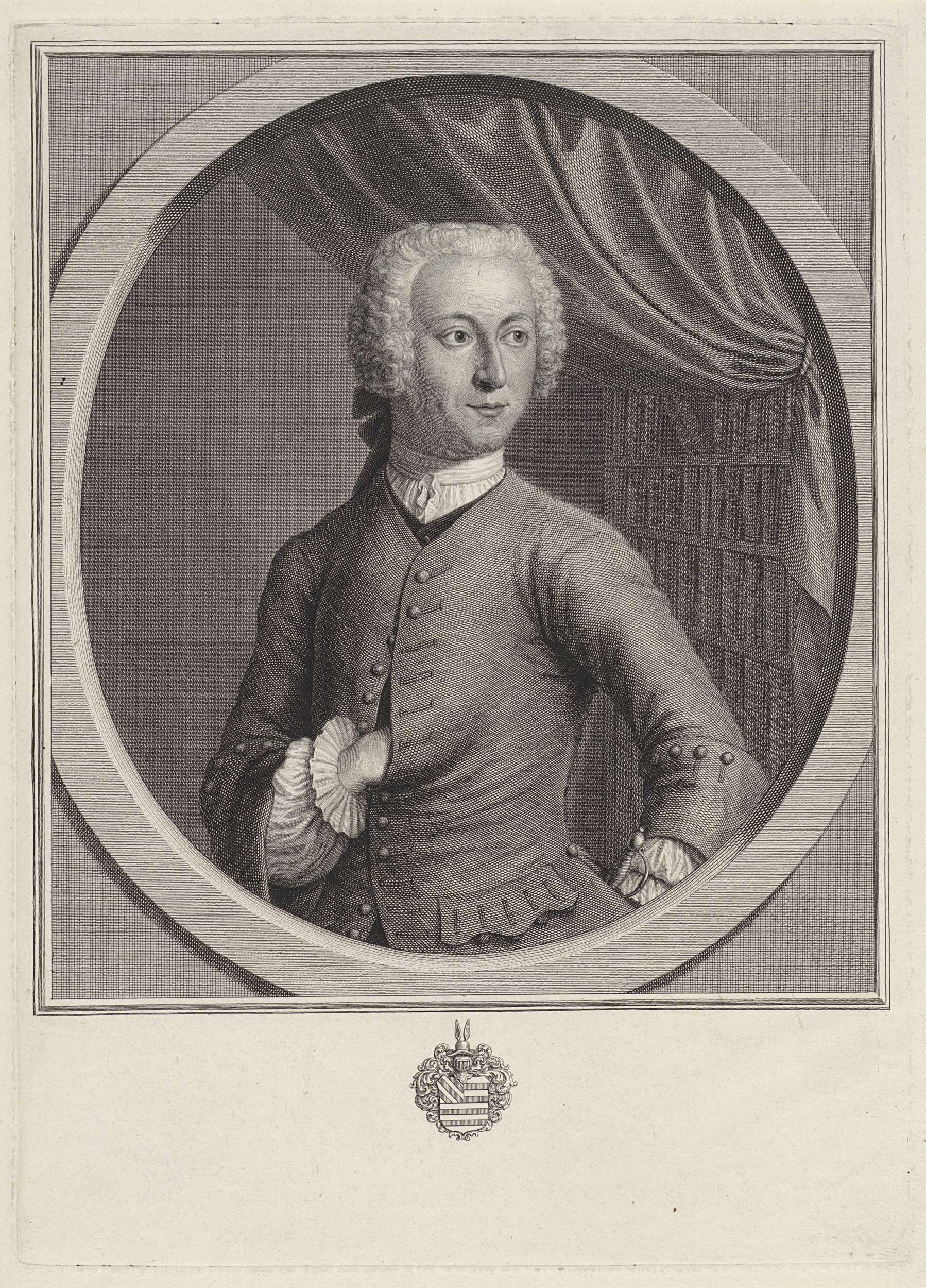 Portret van dichter Willem van Haren staande voor een boekenkast. Midden onder in de marge zijn wapenschild.
