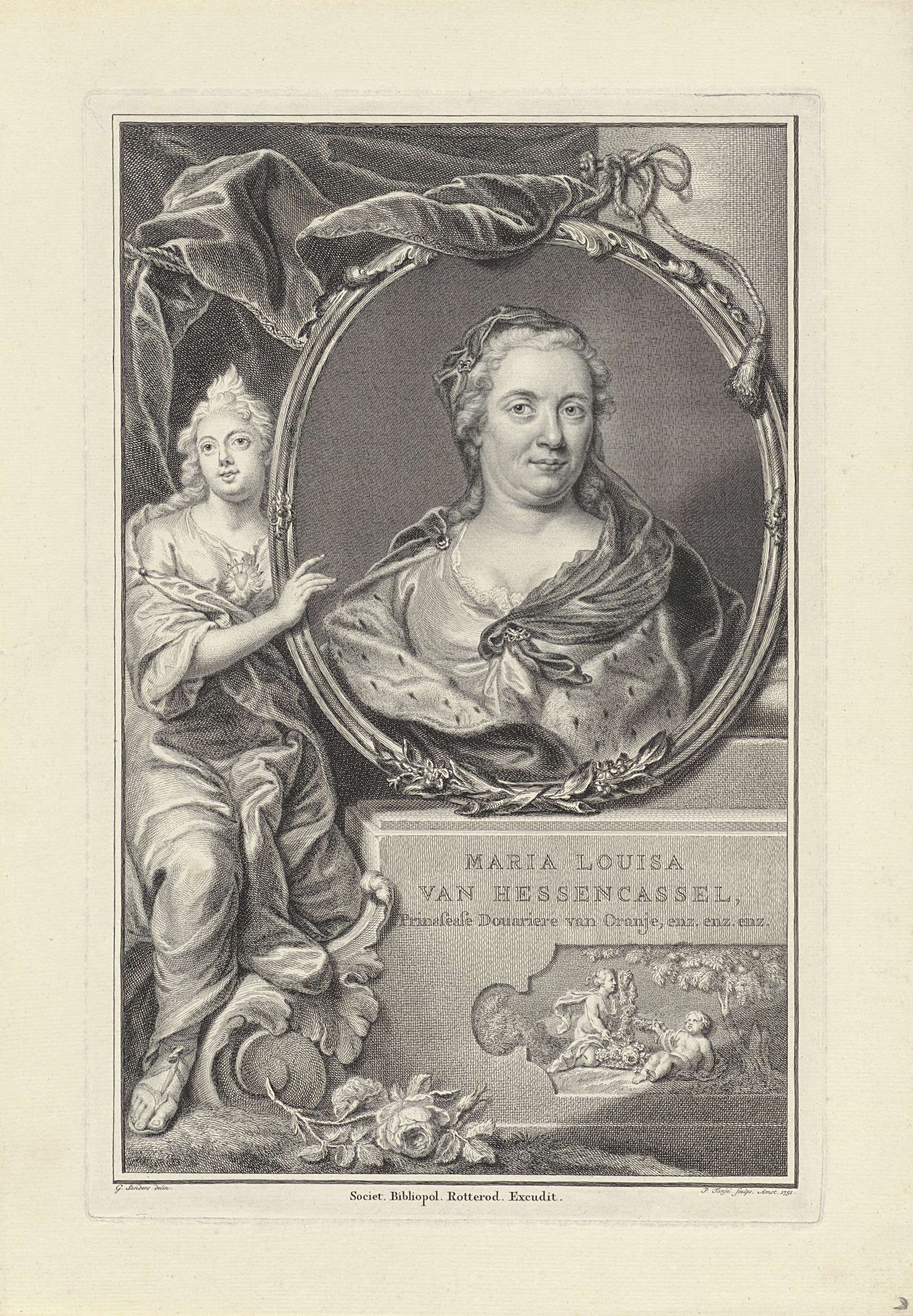 Portret van Maria Louise, prinses van Oranje-Nassau, gekleed in hermelijnen mantel, met een sluier op het hoofd. Zij was de vrouw van prins Johan Willem Friso van Oranje-Nassau en werd na krap twee jaar huwelijk al weduwe. Een vrouw met een met pijlen doorboord hart toont het ovale portret. Het reliëf op het basement toont ...