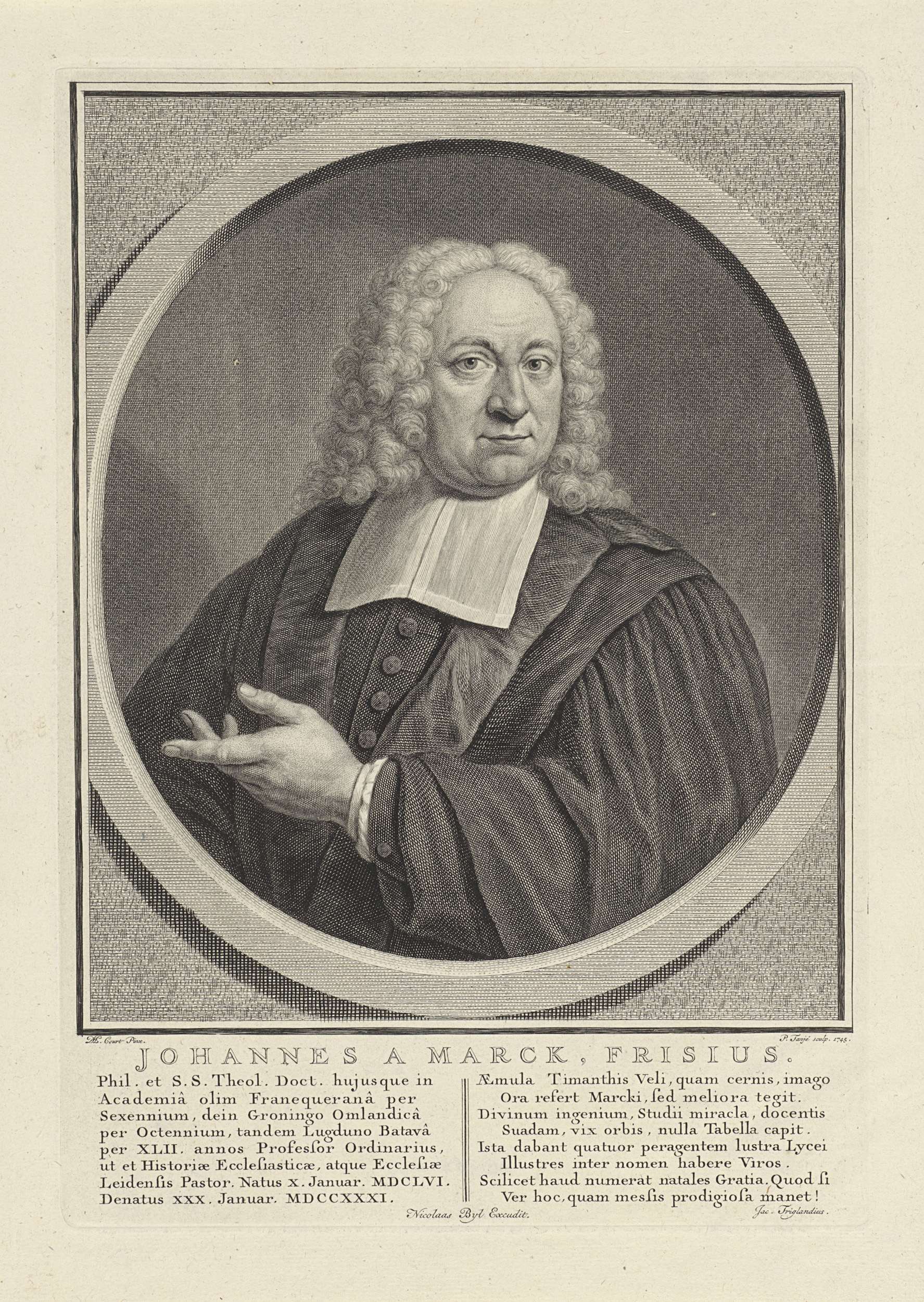 Predikant en hoogleraar in de theologie Johannes à Marck gekleed in toga met witte bef. Onderaan in de marge een tekst in het Latijn.