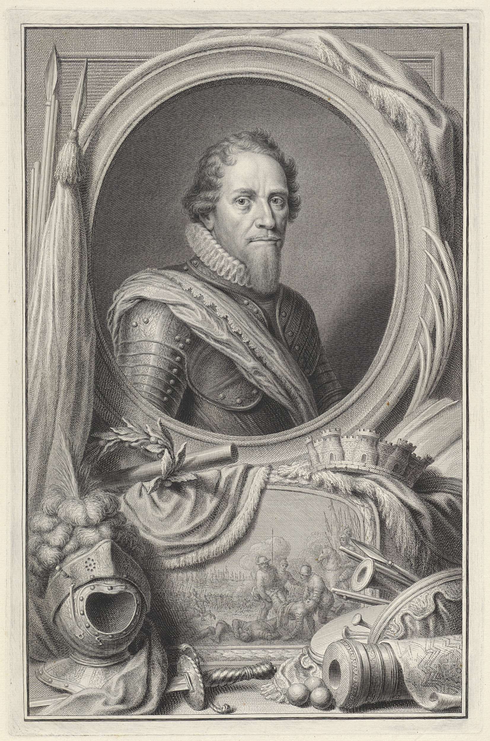 Maurits, prins van Oranje, gekleed in harnas, in een ovale lijst. Onder het portret liggen een scepter, lauwerkrans, muurkroon, helm, zwaard en kanon. Het schilderij toont de slag bij Nieuwpoort.