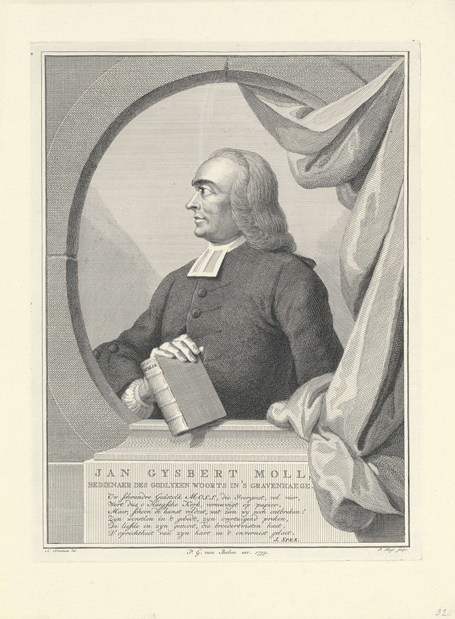 Portret van Jan Gysbert Moll, gereformeerd predikant en hofpredikant te Den Haag, met zijn hand op de Bijbel. Onder het portret een zesregelig vers in het Nederlands.