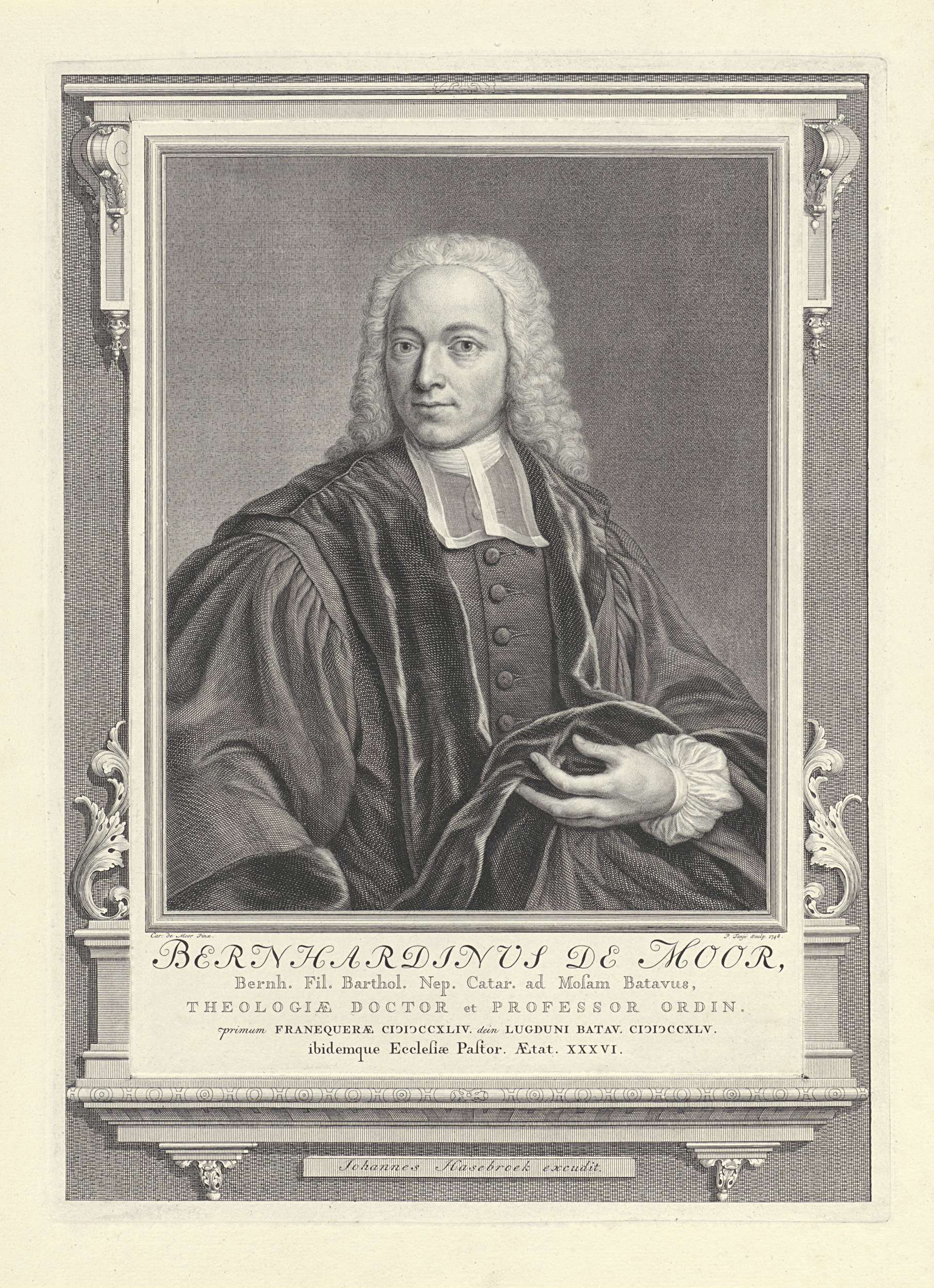 Portret van Bernhardinus de Moor, predikant en hoogleraar in de theologie te Leiden. Het portret is gevat in een ornamentele lijst.