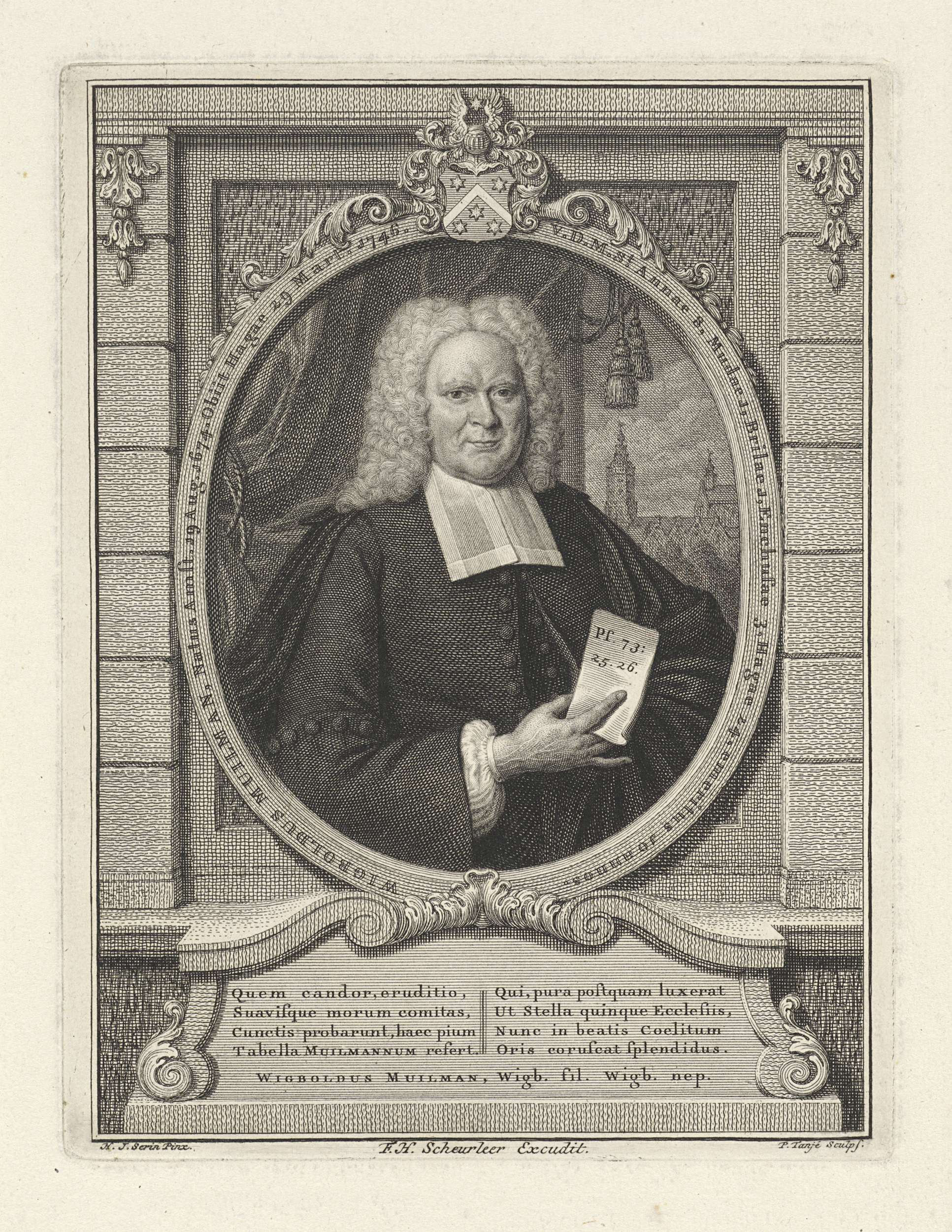 Portret van Wigbold Muilman, predikant Den Haag, in een ornamentele lijst. Midden boven zijn wapenschild.