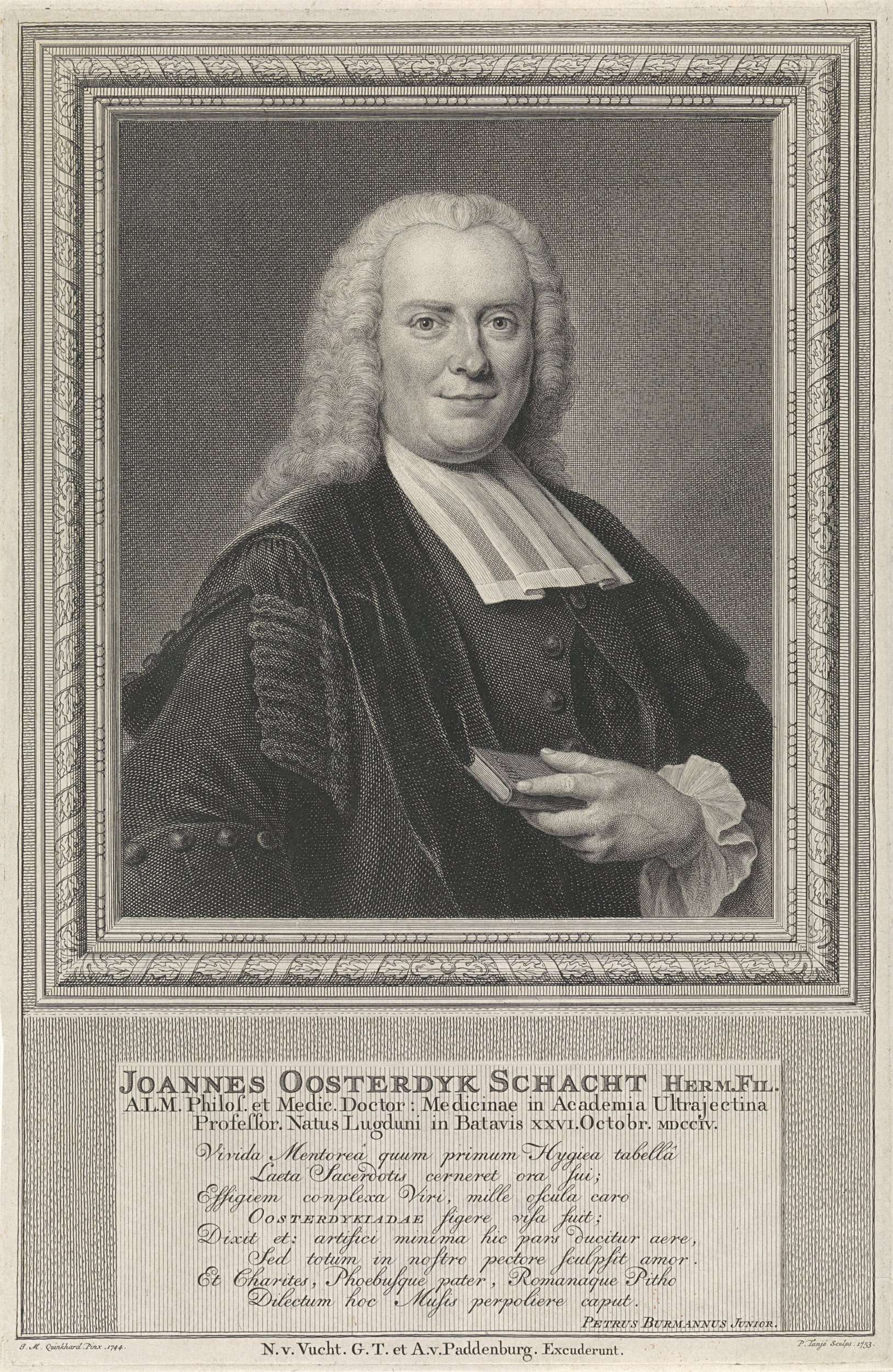 Johannes Oosterdijk Schacht, filosoof en hoogleraar geneeskunde te Utrecht. Onderaan in de marge een achtregelige tekst in het Latijn.