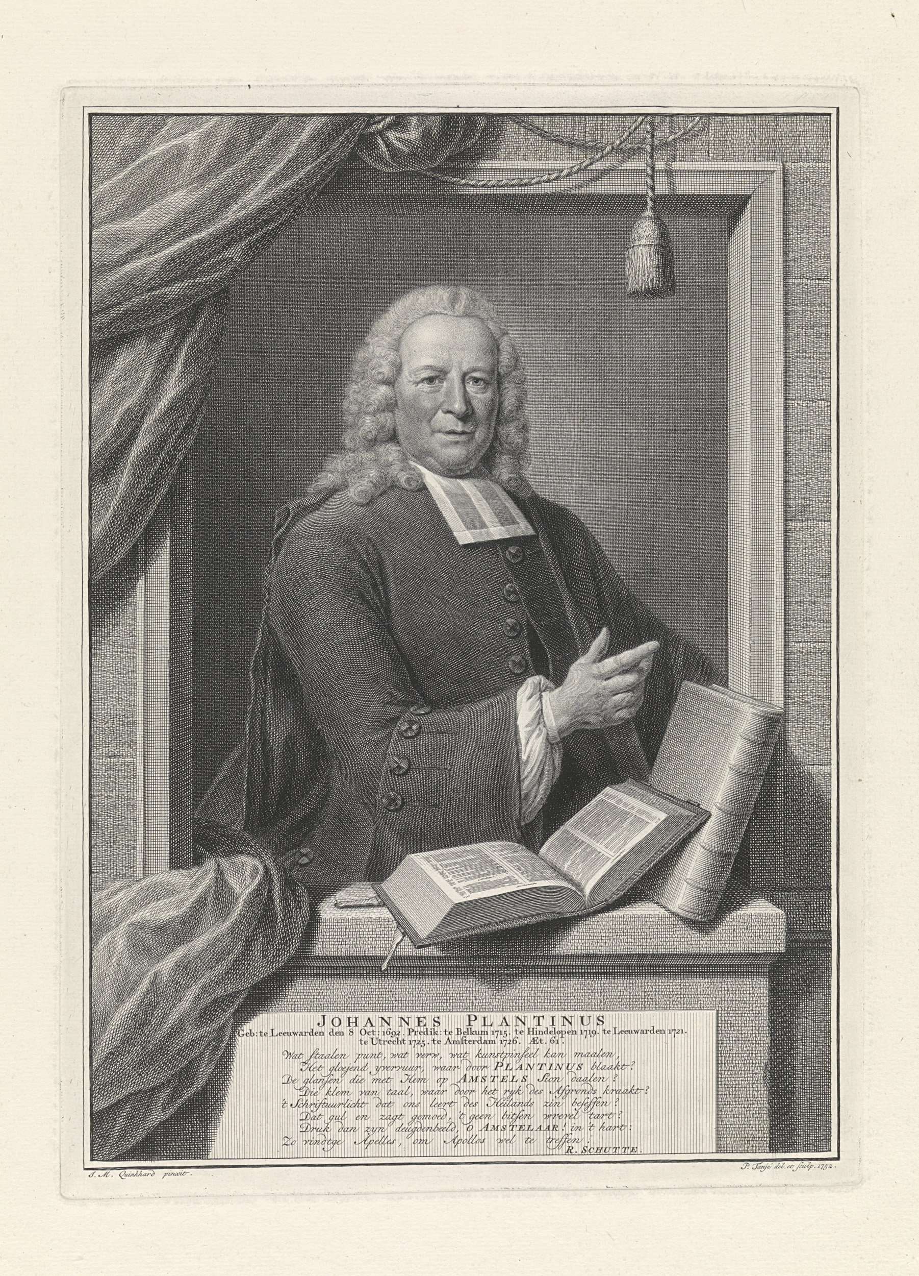 Johannes Plantinus, predikant te Amsterdam, op 61-jarige leeftijd. Hij staat bij een opengeslagen Bijbel. Onderaan een achtregelig vers in het Nederlands.