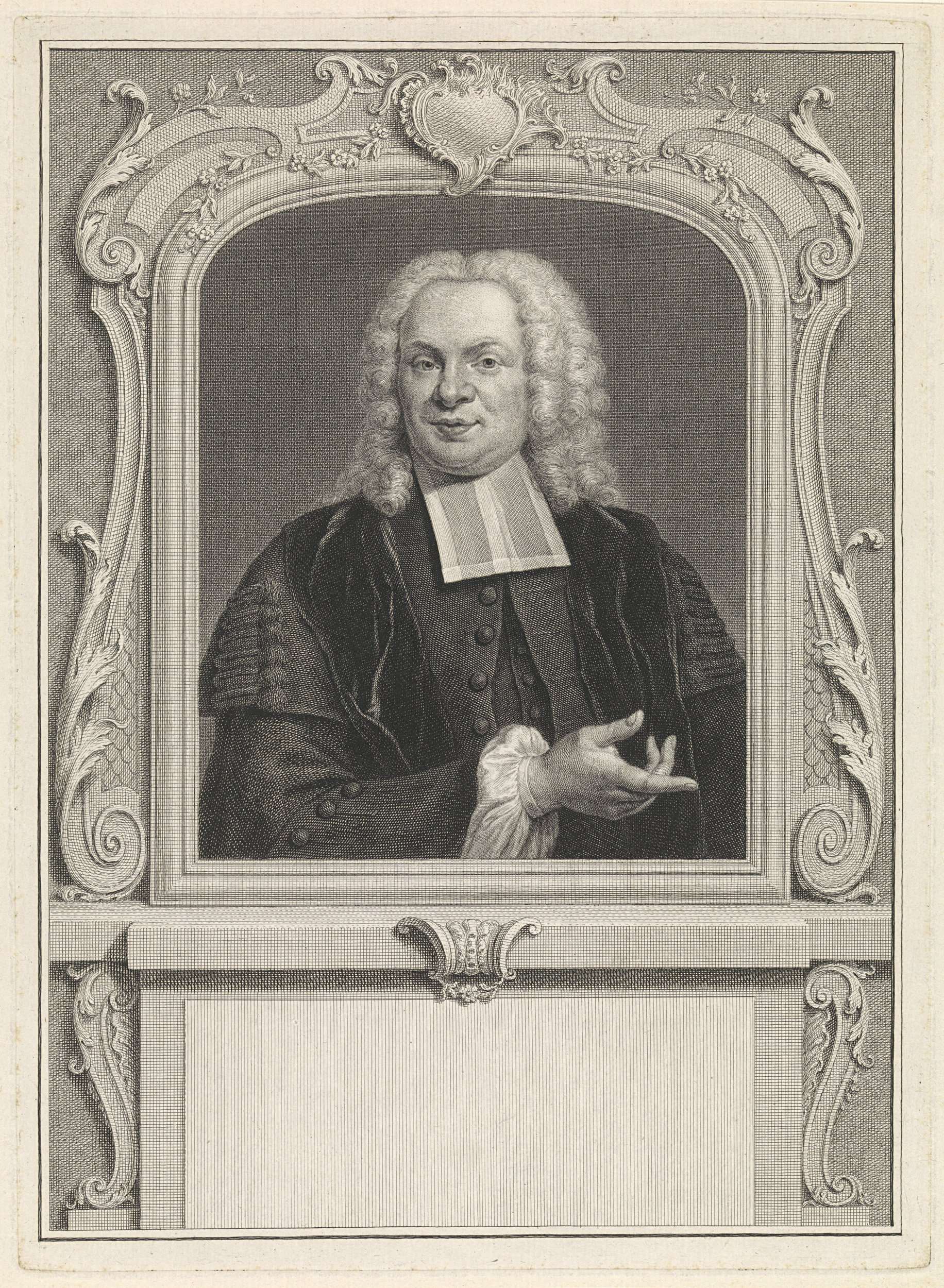 Portret van Albertus Voget, predikant en hoogleraar in de theologie, in een ornamentele lijst.