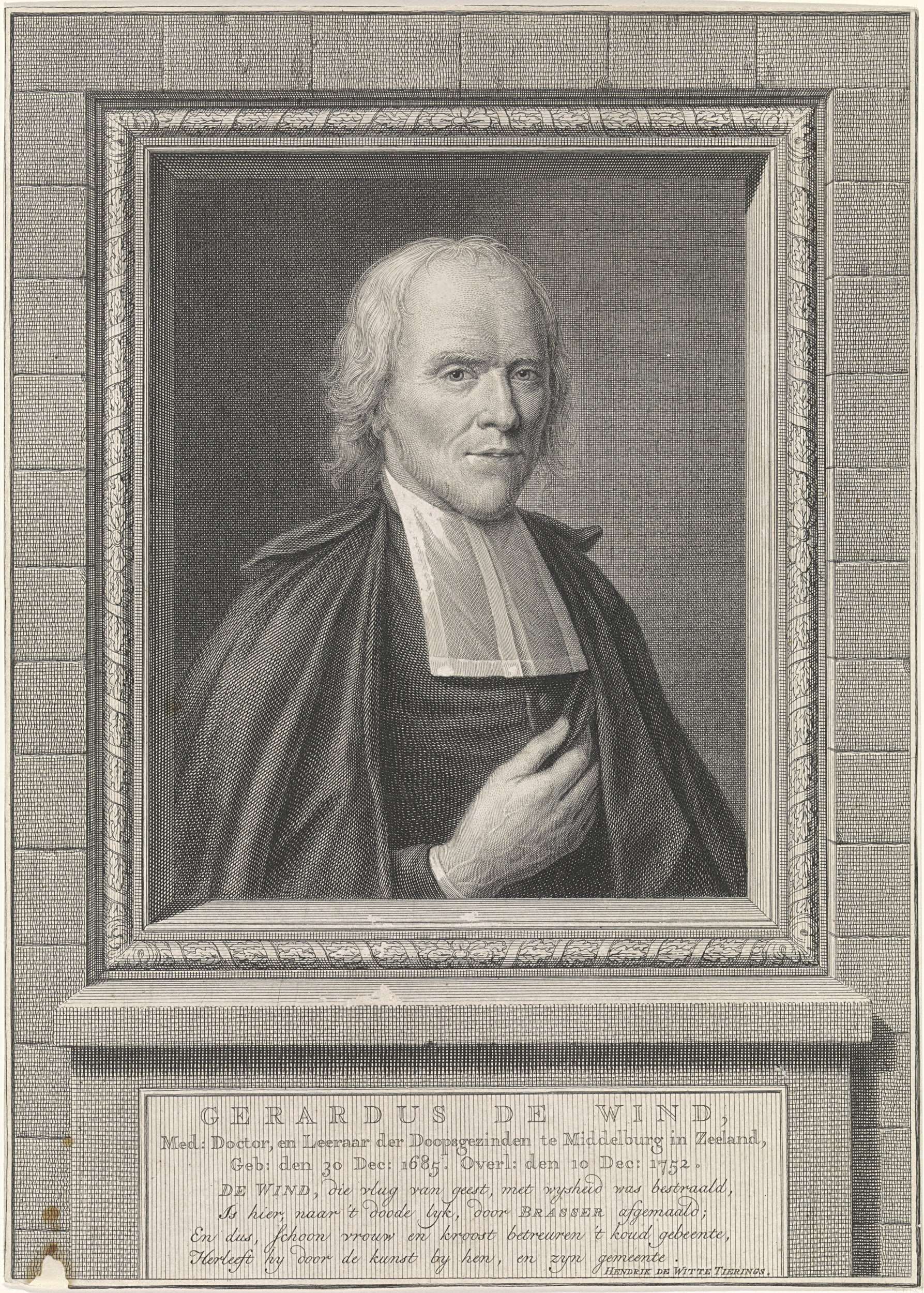 Portret van Gerardus de Wind, arts en doopsgezind predikant te Middelburg. Onder het portret zijn geboort- en sterfdata en een vierregelig vers in het Nederlands.
