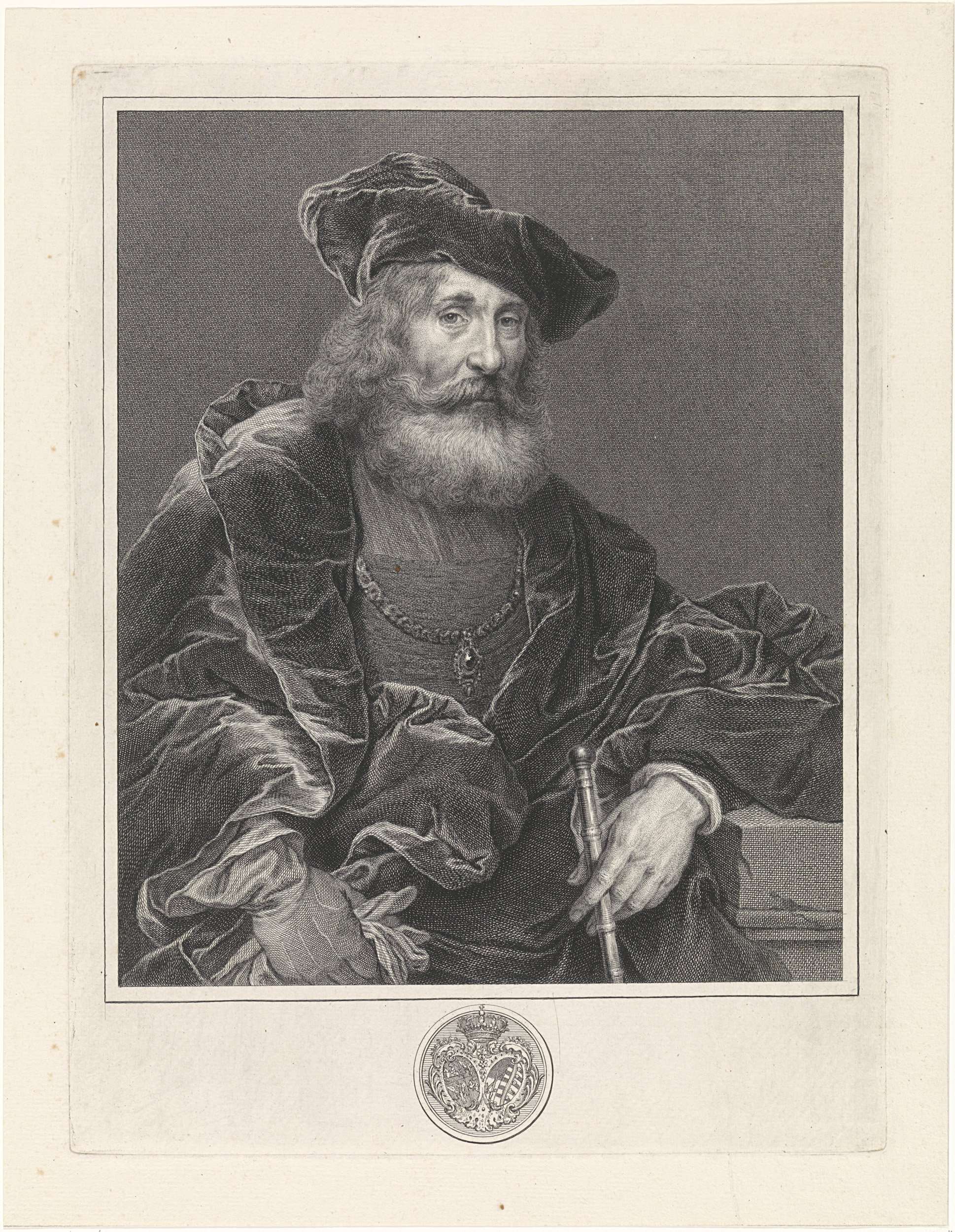 Portret van een bebaarde man met een baret op het hoofd en een staf in de hand. Om zijn hals een ketting met een hanger. Midden onder de gekroonde wapenschilden van de keurvorsten van Saksen, die het originele schilderij in bezit hadden.