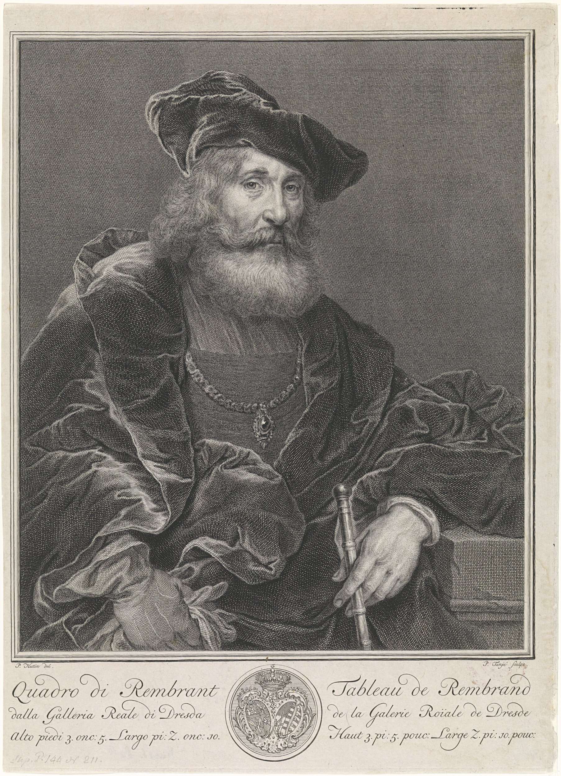 Portret van een bebaarde man met een baret op het hoofd en een staf in de hand. Om zijn hals een ketting met een hanger. Onderaan in de marge de gekroonde wapenschilden van de keurvorsten van Saksen, de naam van de Koninklijke Verzameling in Dresden en de maten van het originele schilderij in het Italiaans ...